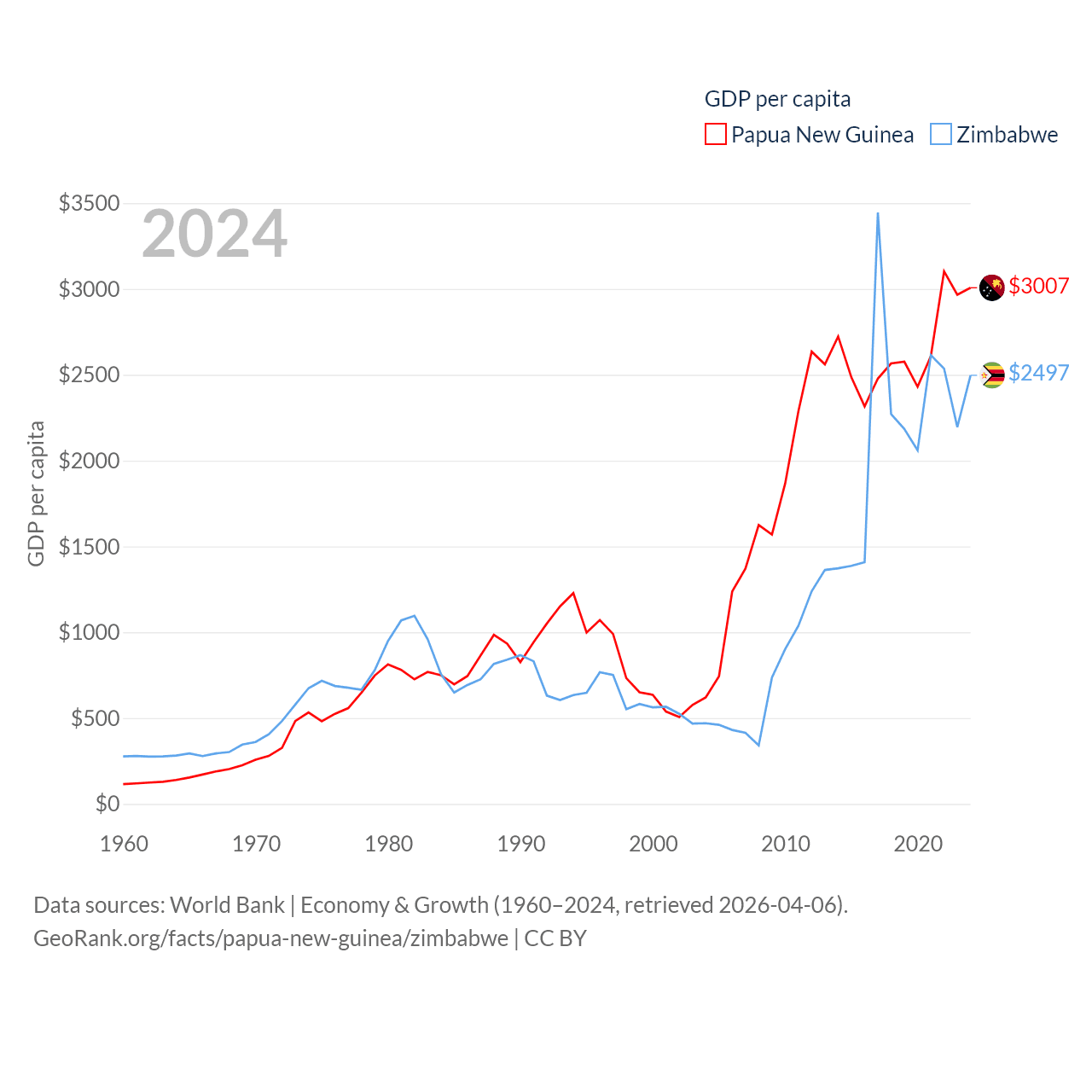 By GDP, Papua New Guinea ranks 110/197 ($31.8B) and Zimbabwe ranks 102/197 ($41.5B). By GDP per capita, Papua New Guinea ranks 140/197 ($3,007), while Zimbabwe ranks 148/197 ($2,497).