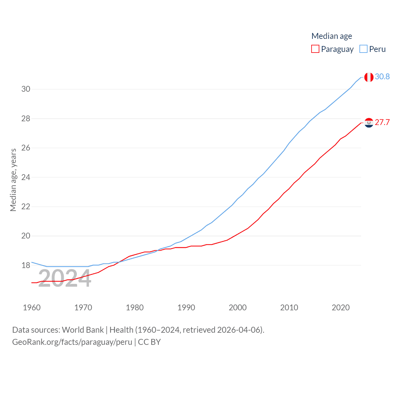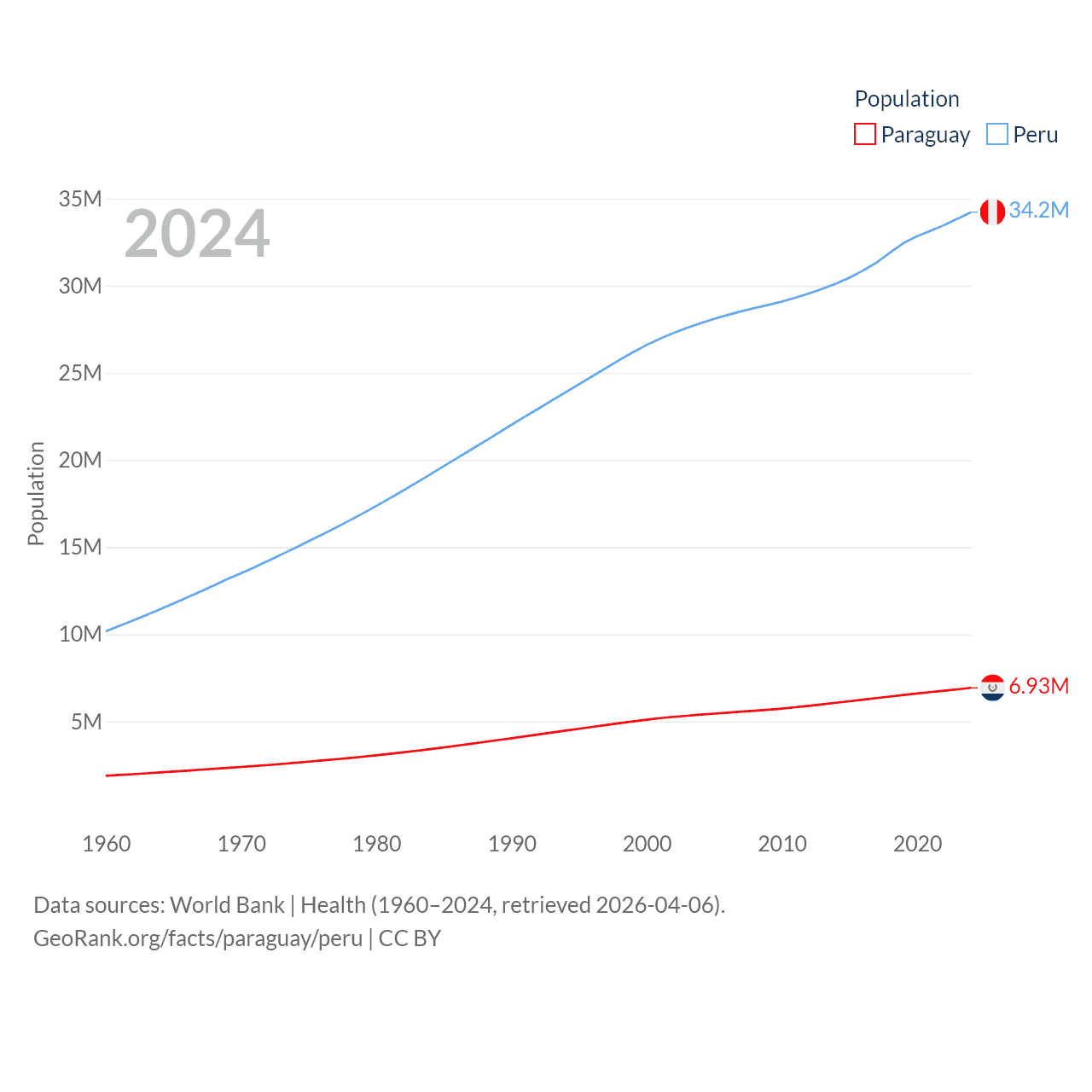 Paraguay has a population of 6.93M (ranked 107/197), compared with 34.2M in Peru (ranked 48/197). Paraguay's land area is 152,901 sq mi versus 494,211 sq mi for Peru (ranked 59th vs. 19th).