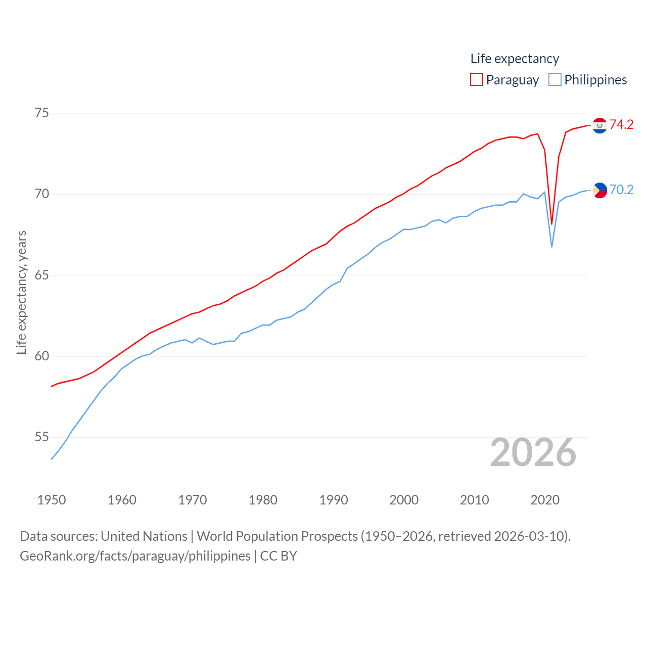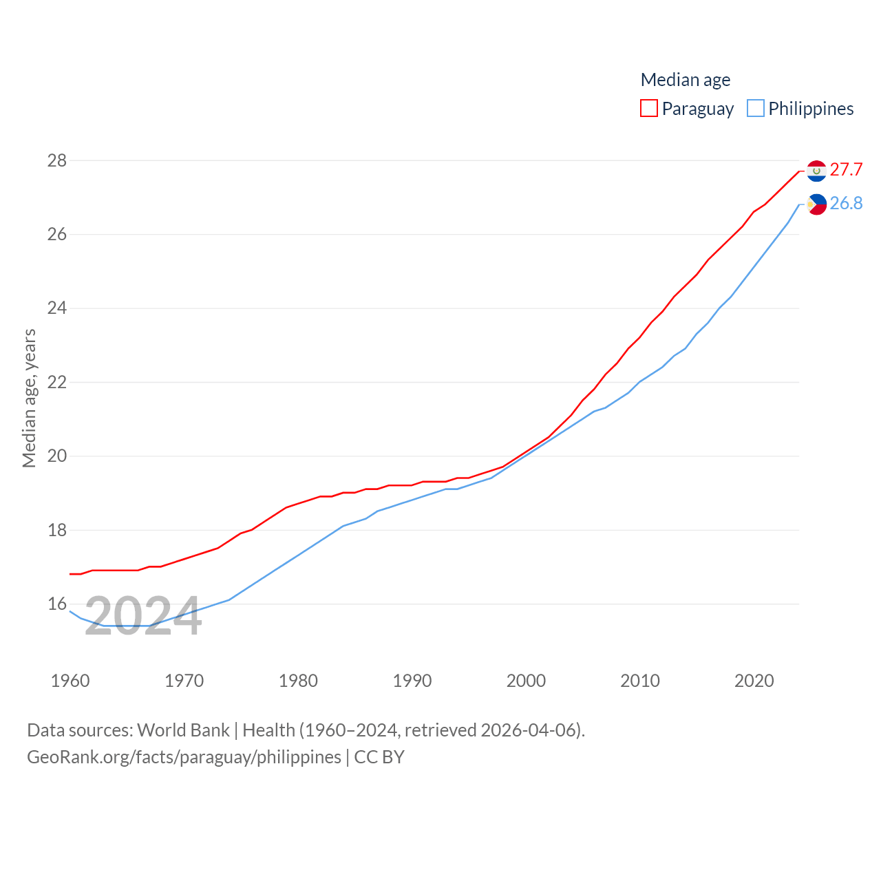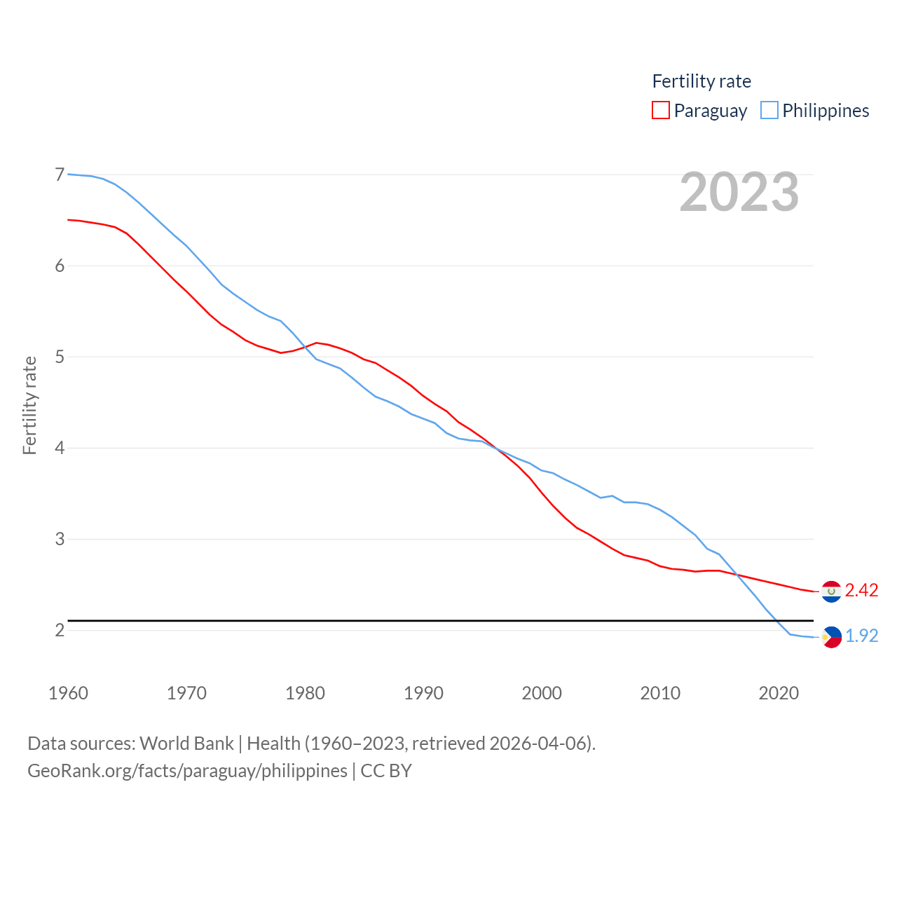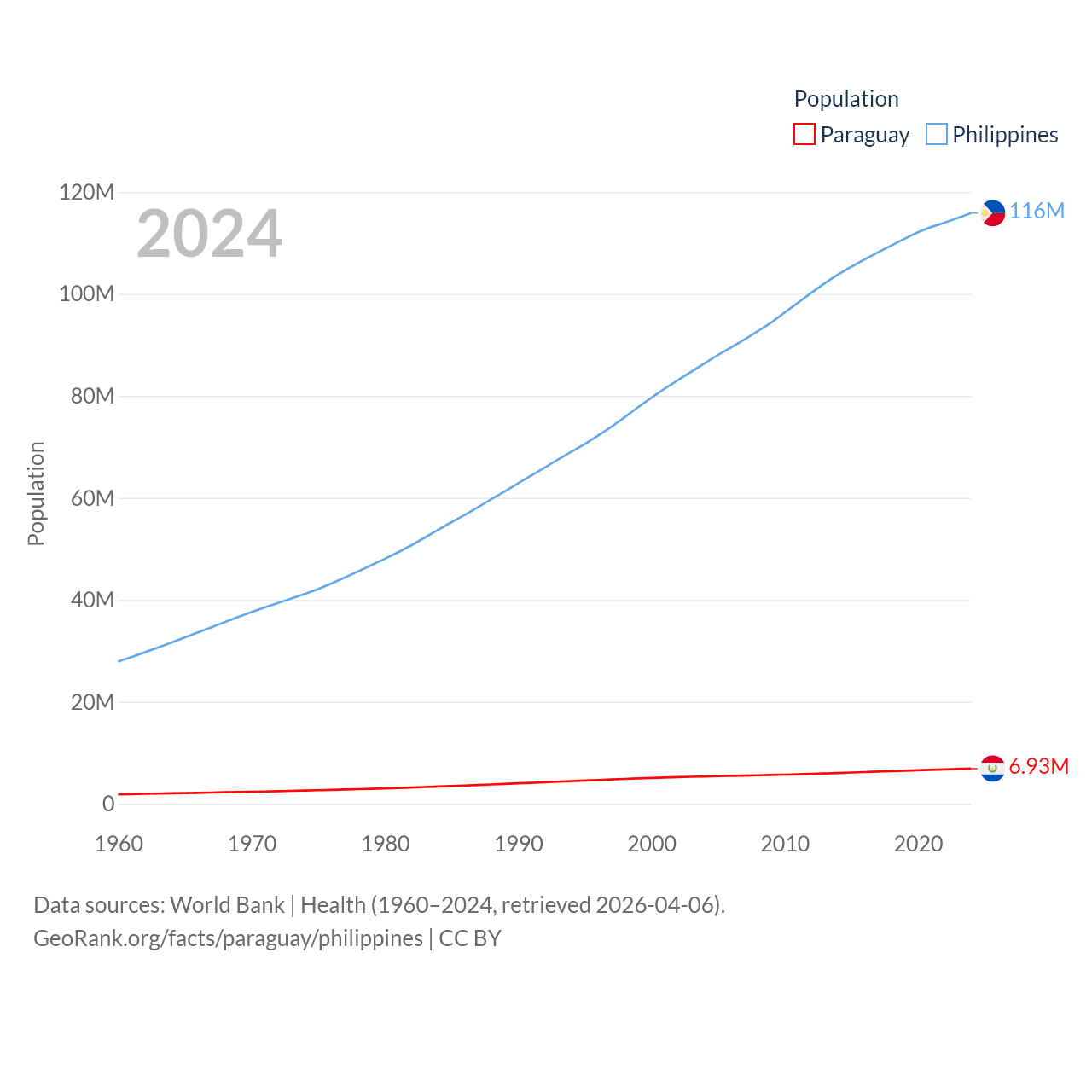 Paraguay has a population of 6.93M (ranked 107/197), compared with 116M in The Philippines (ranked 14/197). Paraguay's land area is 152,901 sq mi versus 115,124 sq mi for The Philippines (ranked 59th vs. 71st).