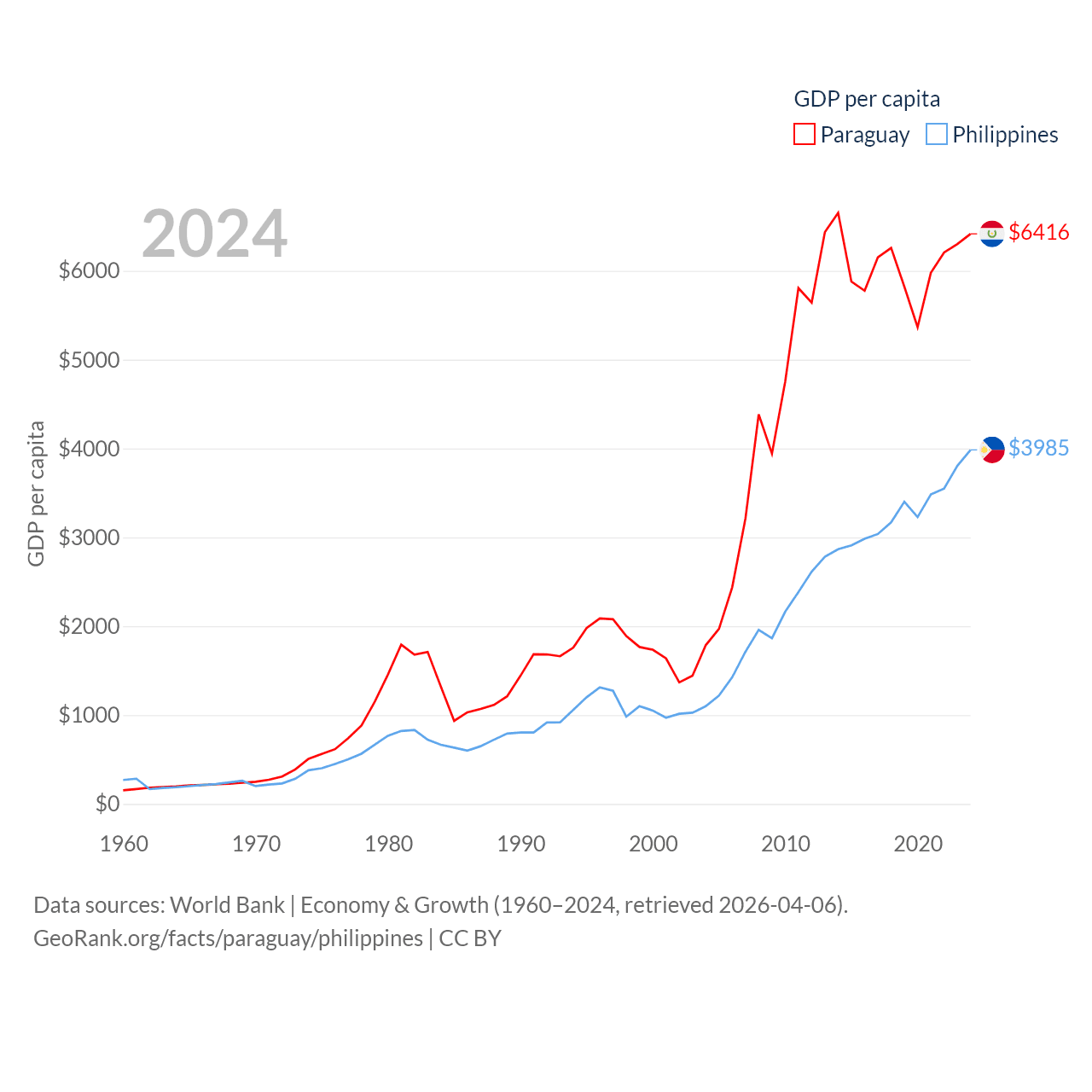 By GDP, Paraguay ranks 98/197 ($44.5B) and The Philippines ranks 35/197 ($462B). By GDP per capita, Paraguay ranks 109/197 ($6,416), while The Philippines ranks 130/197 ($3,985).