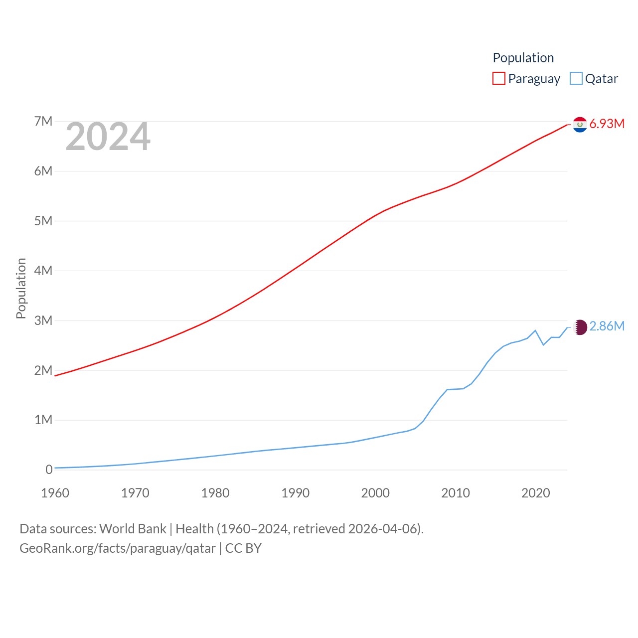 Paraguay has a population of 6.93M (ranked 107/197), compared with 2.86M in Qatar (ranked 138/197). Paraguay's land area is 152,901 sq mi versus 4,436 sq mi for Qatar (ranked 59th vs. 158th).