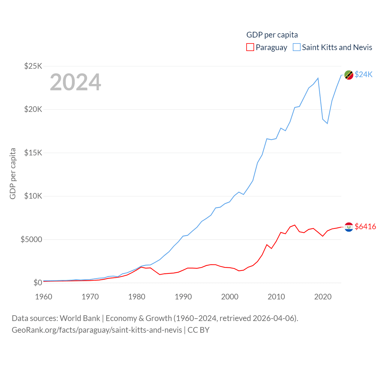 By GDP, Paraguay ranks 98/197 ($44.5B) and Saint Kitts and Nevis ranks 187/197 ($1.12B). By GDP per capita, Paraguay ranks 109/197 ($6,416), while Saint Kitts and Nevis ranks 51/197 ($23,961).