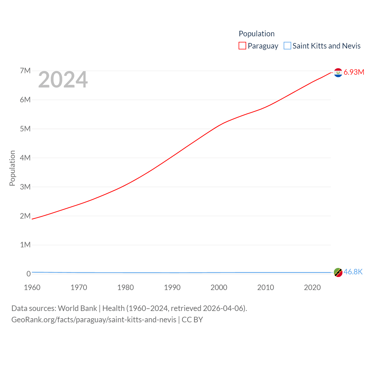 Paraguay has a population of 6.93M (ranked 107/197), compared with 46.8K in Saint Kitts and Nevis (ranked 189/197). Paraguay's land area is 152,901 sq mi versus 100.4 sq mi for Saint Kitts and Nevis (ranked 59th vs. 189th).