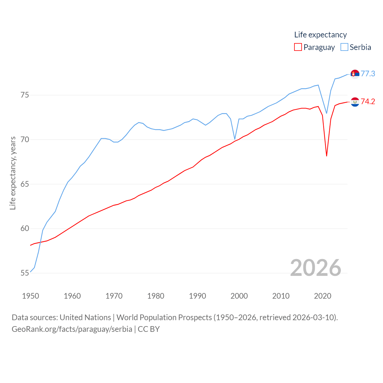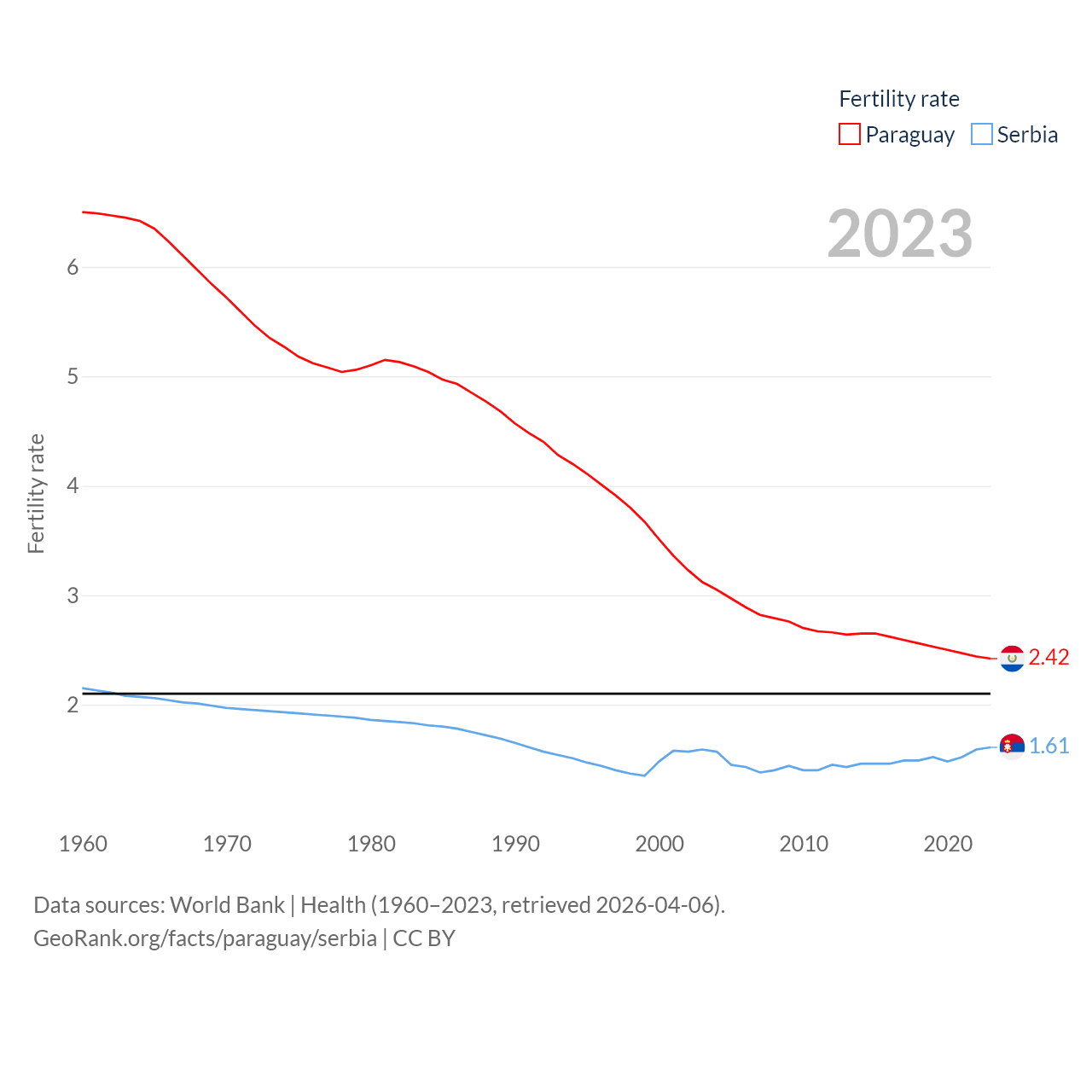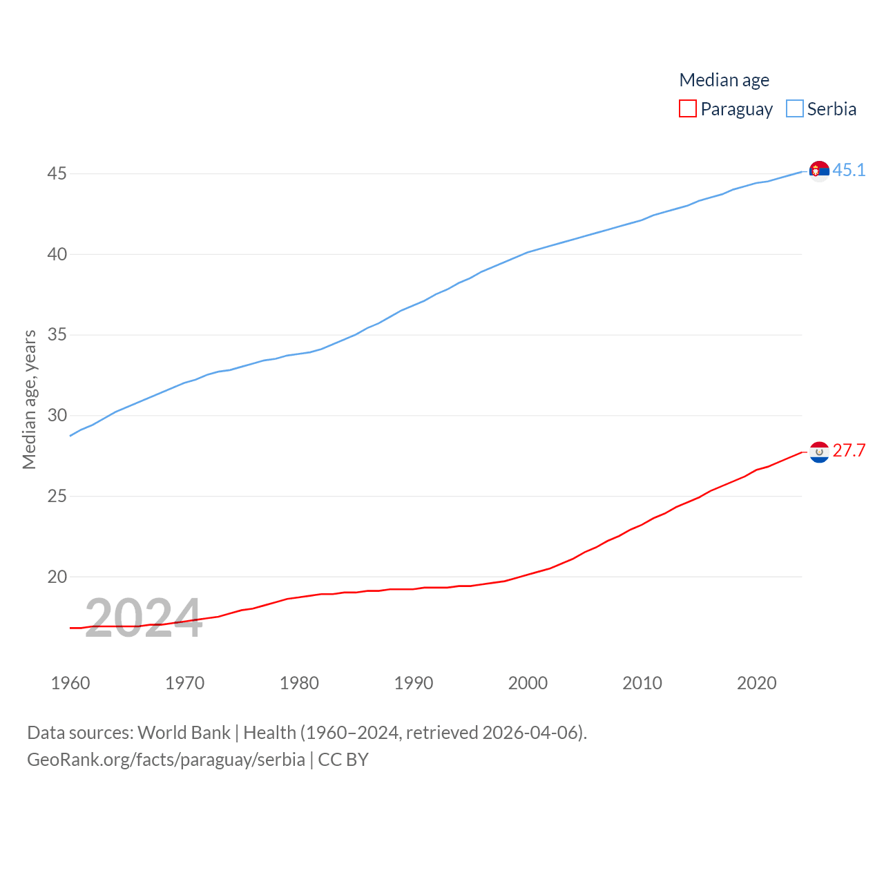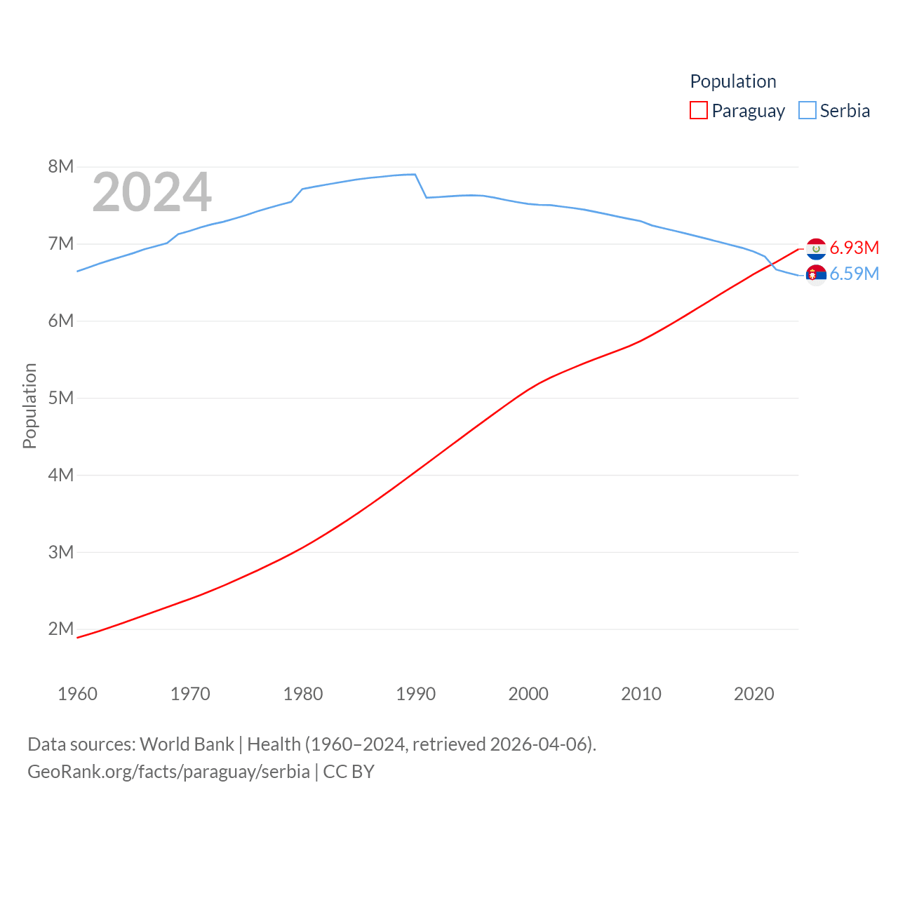 Paraguay has a population of 6.93M (ranked 107/197), compared with 6.59M in Serbia (ranked 109/197). Paraguay's land area is 152,901 sq mi versus 32,467 sq mi for Serbia (ranked 59th vs. 111th).