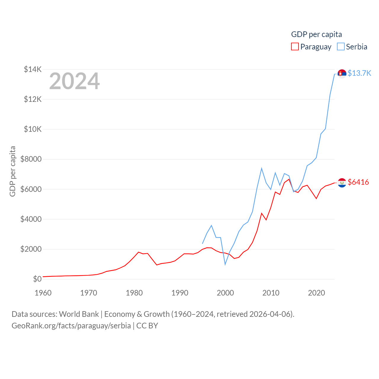 By GDP, Paraguay ranks 98/197 ($44.5B) and Serbia ranks 76/197 ($90.1B). By GDP per capita, Paraguay ranks 109/197 ($6,416), while Serbia ranks 73/197 ($13,679).