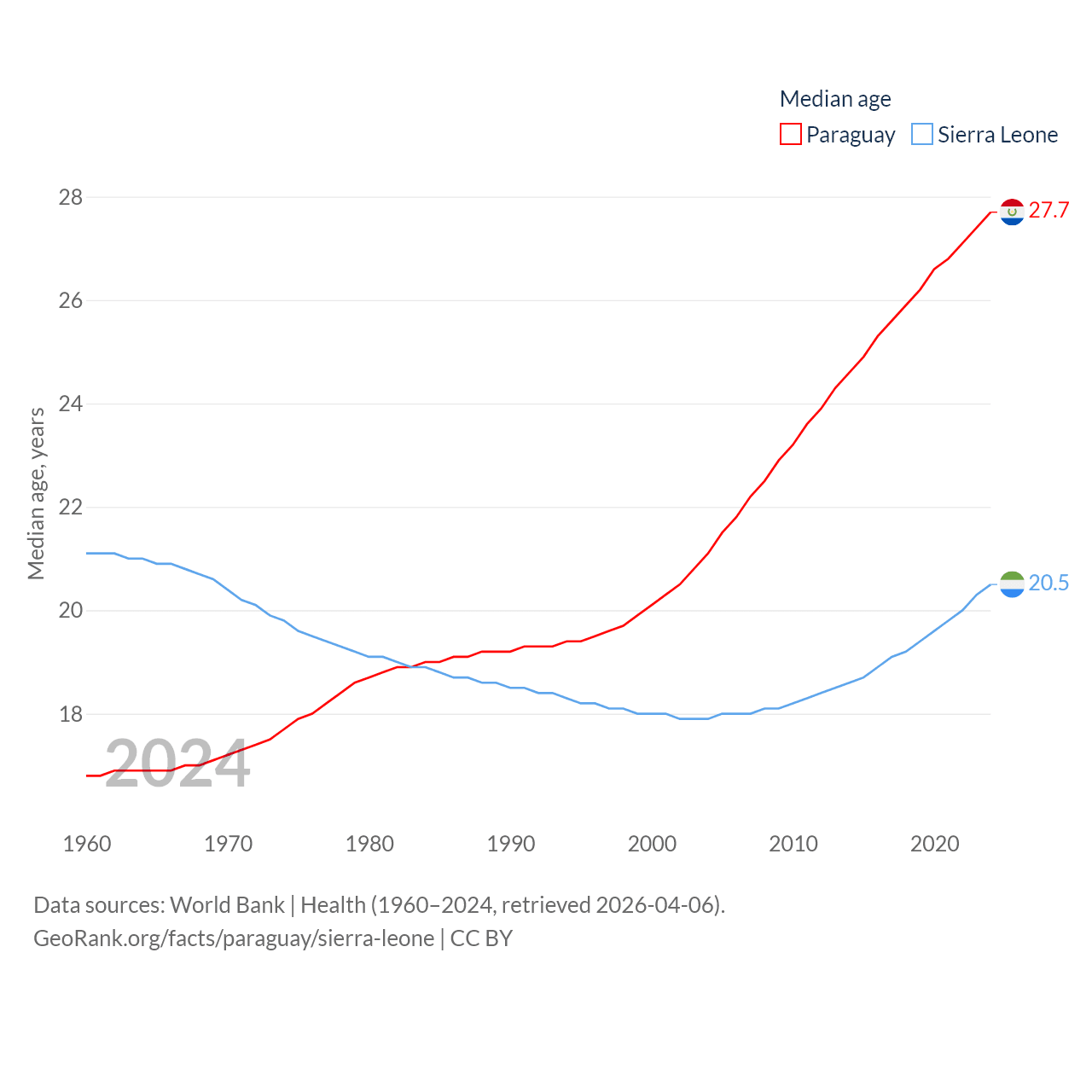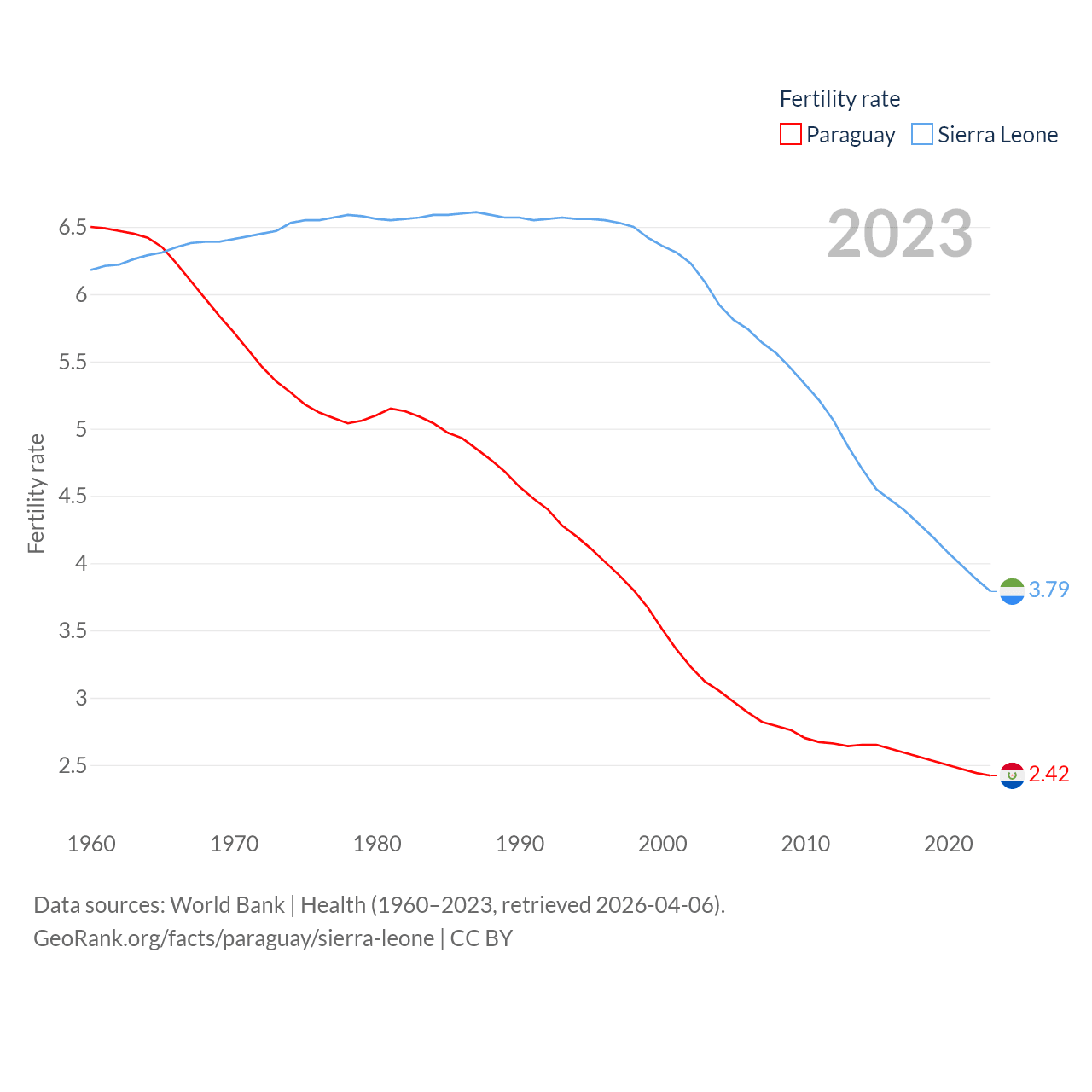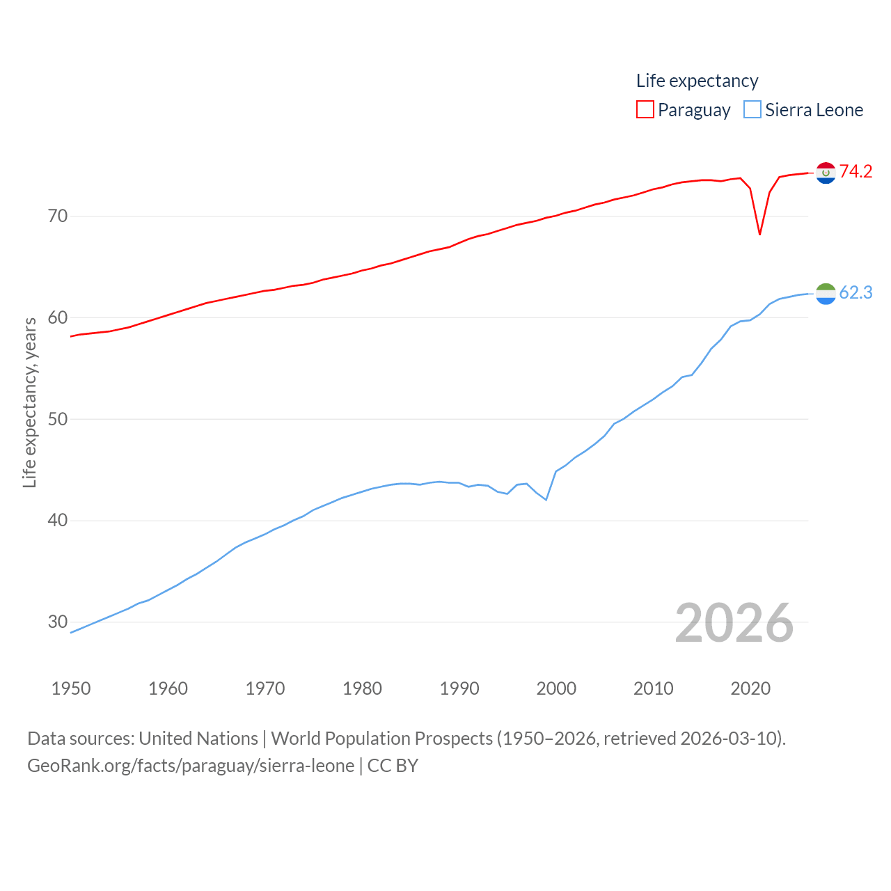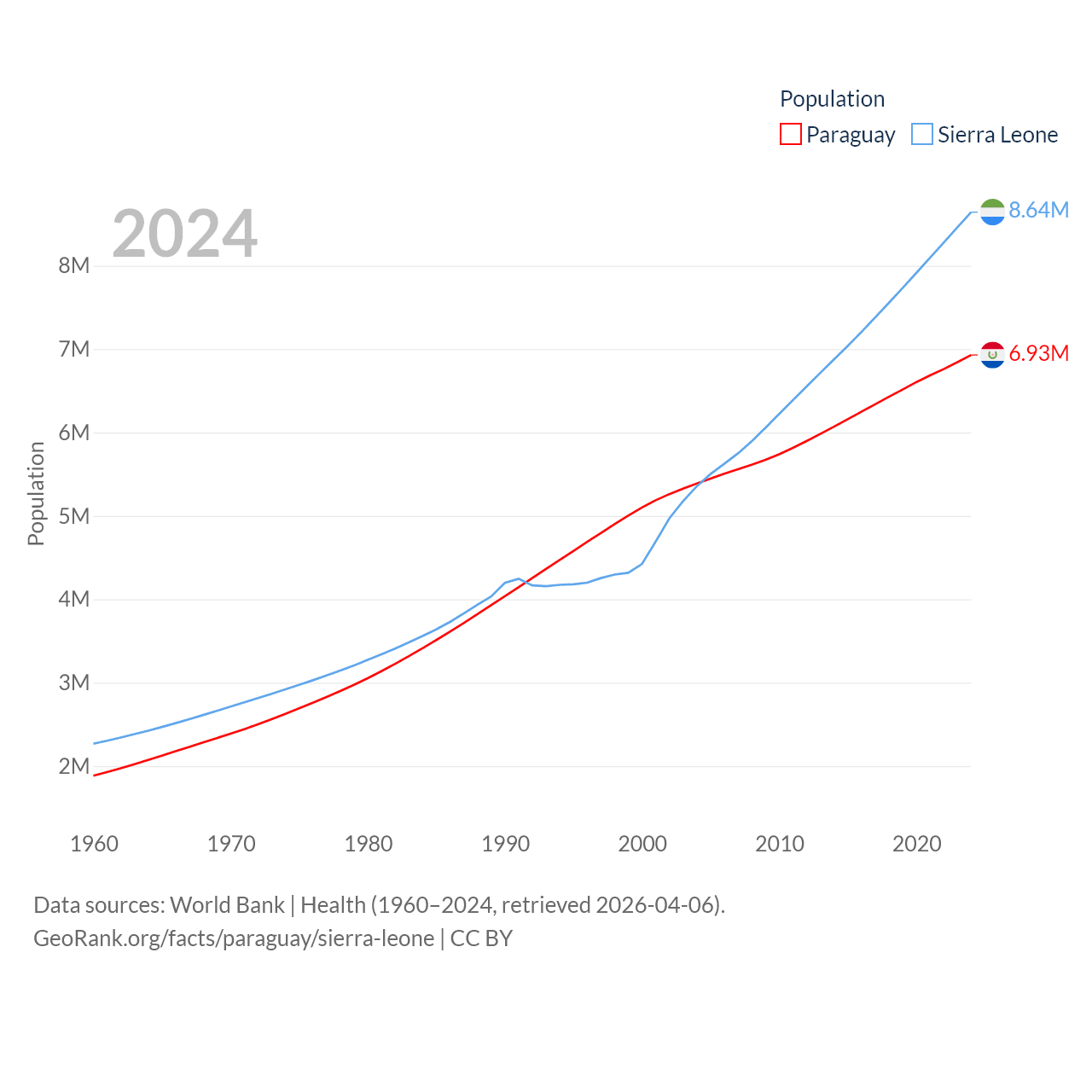 Paraguay has a population of 6.93M (ranked 107/197), compared with 8.64M in Sierra Leone (ranked 102/197). Paraguay's land area is 152,901 sq mi versus 27,869 sq mi for Sierra Leone (ranked 59th vs. 116th).