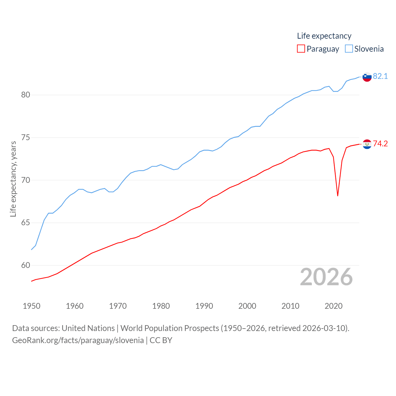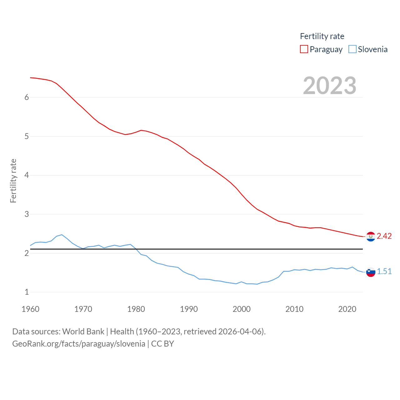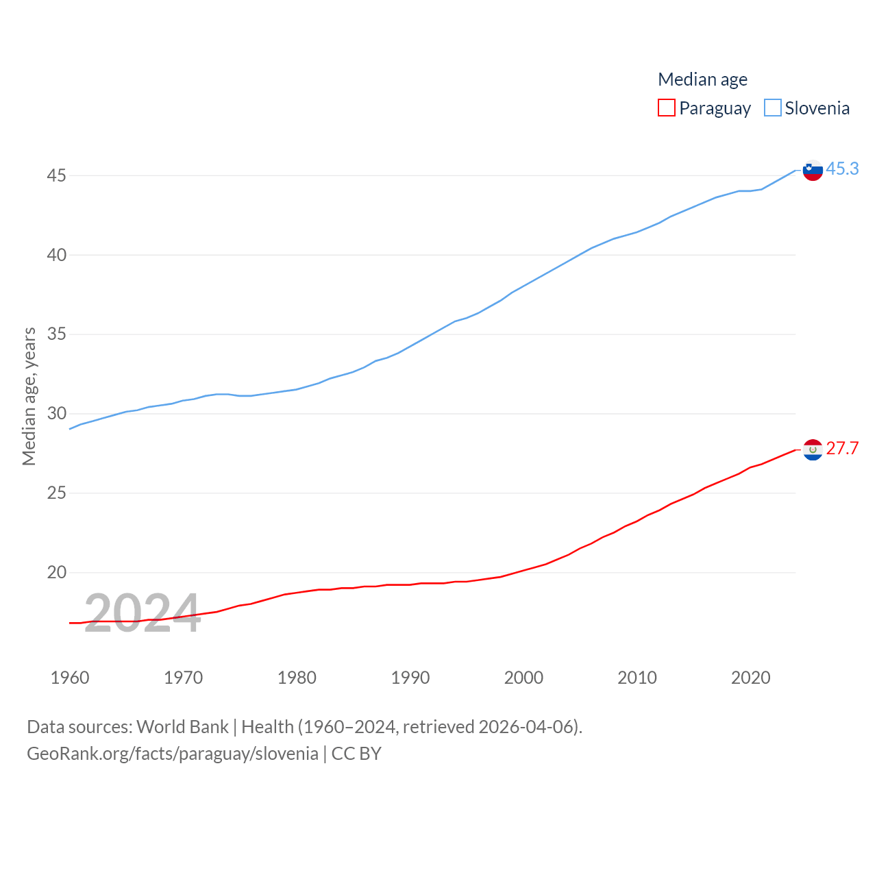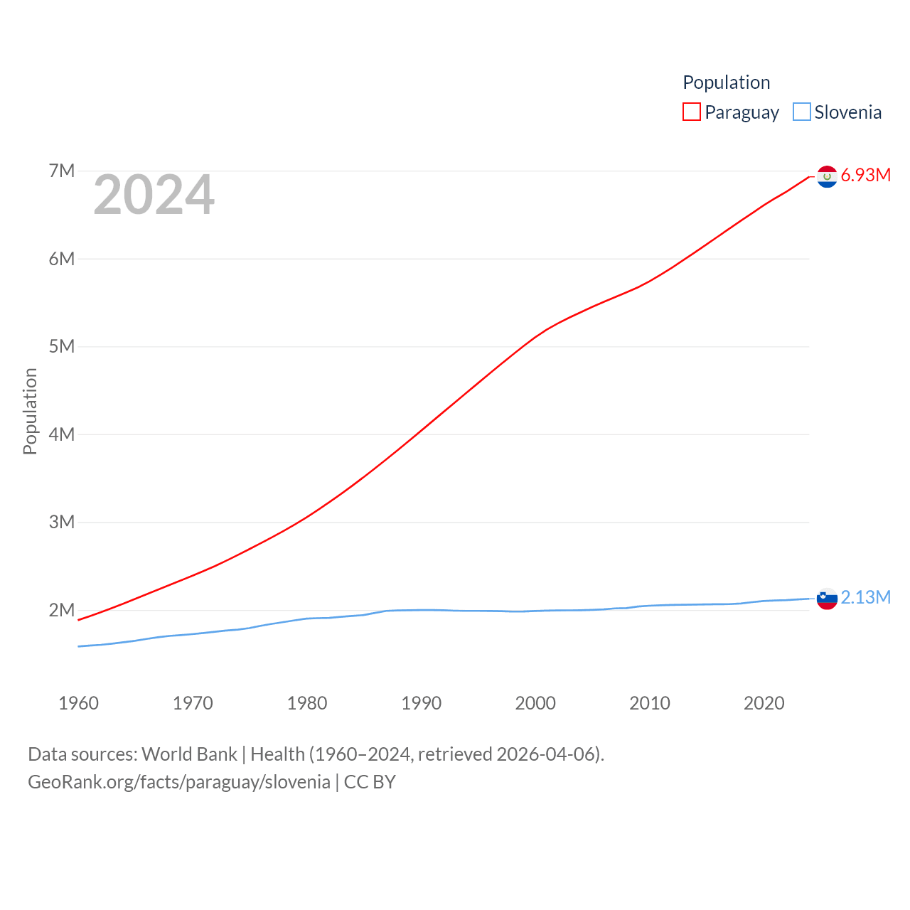 Paraguay has a population of 6.93M (ranked 107/197), compared with 2.13M in Slovenia (ranked 147/197). Paraguay's land area is 152,901 sq mi versus 7,774 sq mi for Slovenia (ranked 59th vs. 151st).