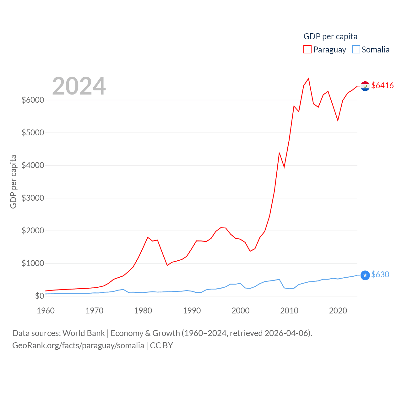 By GDP, Paraguay ranks 98/197 ($44.5B) and Somalia ranks 150/197 ($12B). By GDP per capita, Paraguay ranks 109/197 ($6,416), while Somalia ranks 192/197 ($630).
