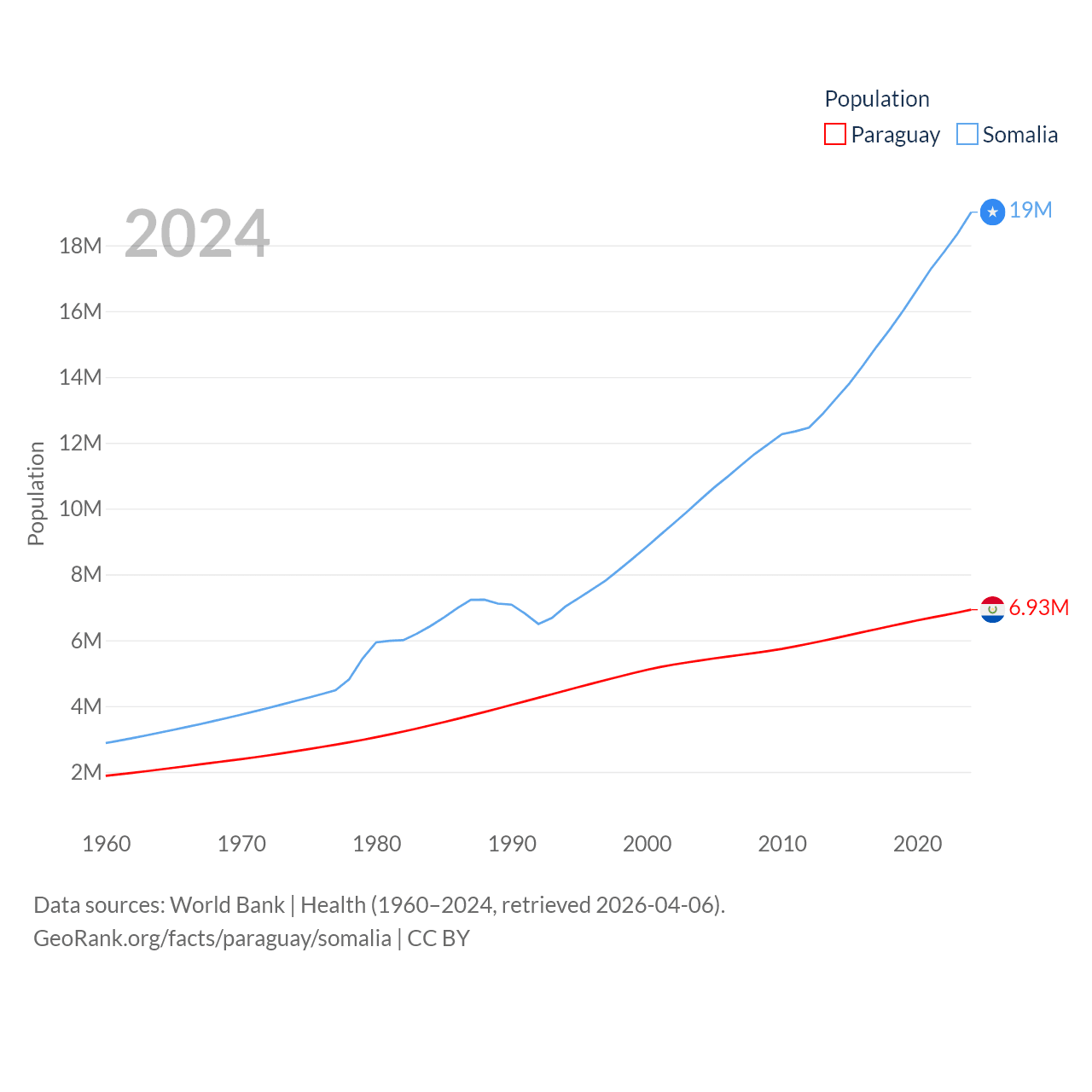 Paraguay has a population of 6.93M (ranked 107/197), compared with 19M in Somalia (ranked 68/197). Paraguay's land area is 152,901 sq mi versus 242,217 sq mi for Somalia (ranked 59th vs. 42nd).