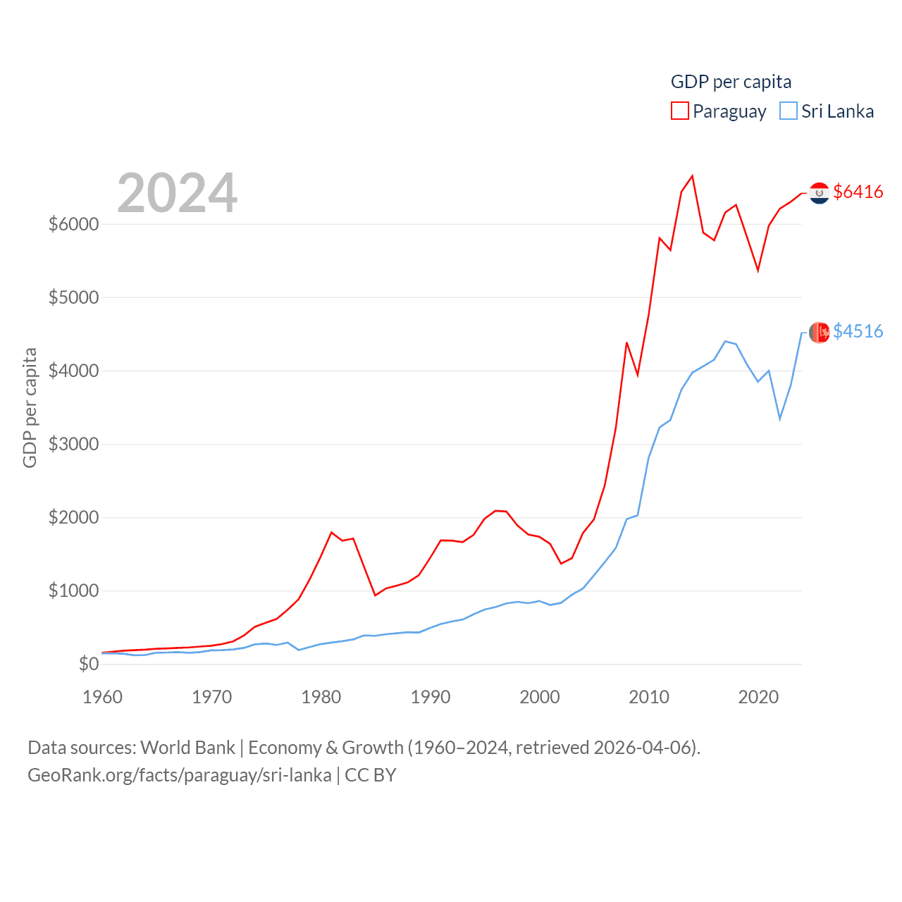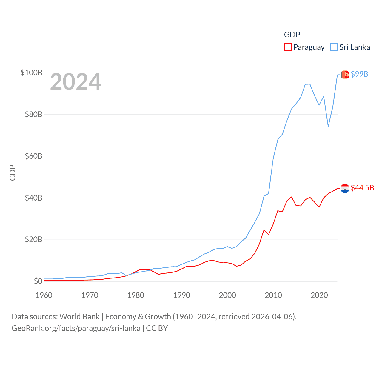 By GDP, Paraguay ranks 98/197 ($44.5B) and Sri Lanka ranks 72/197 ($99B). By GDP per capita, Paraguay ranks 109/197 ($6,416), while Sri Lanka ranks 124/197 ($4,516).
