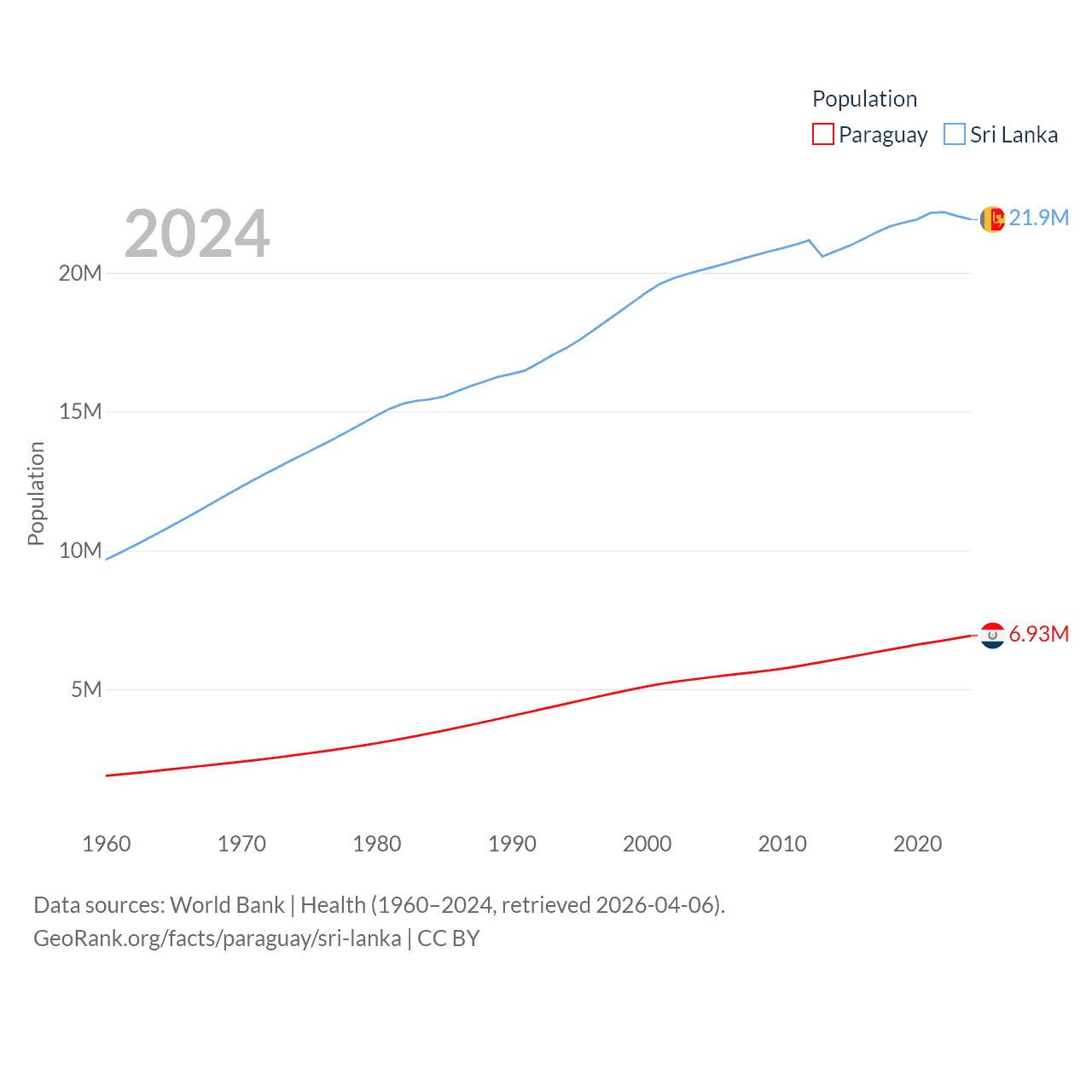 Paraguay has a population of 6.93M (ranked 107/197), compared with 21.9M in Sri Lanka (ranked 61/197). Paraguay's land area is 152,901 sq mi versus 23,884 sq mi for Sri Lanka (ranked 59th vs. 122nd).