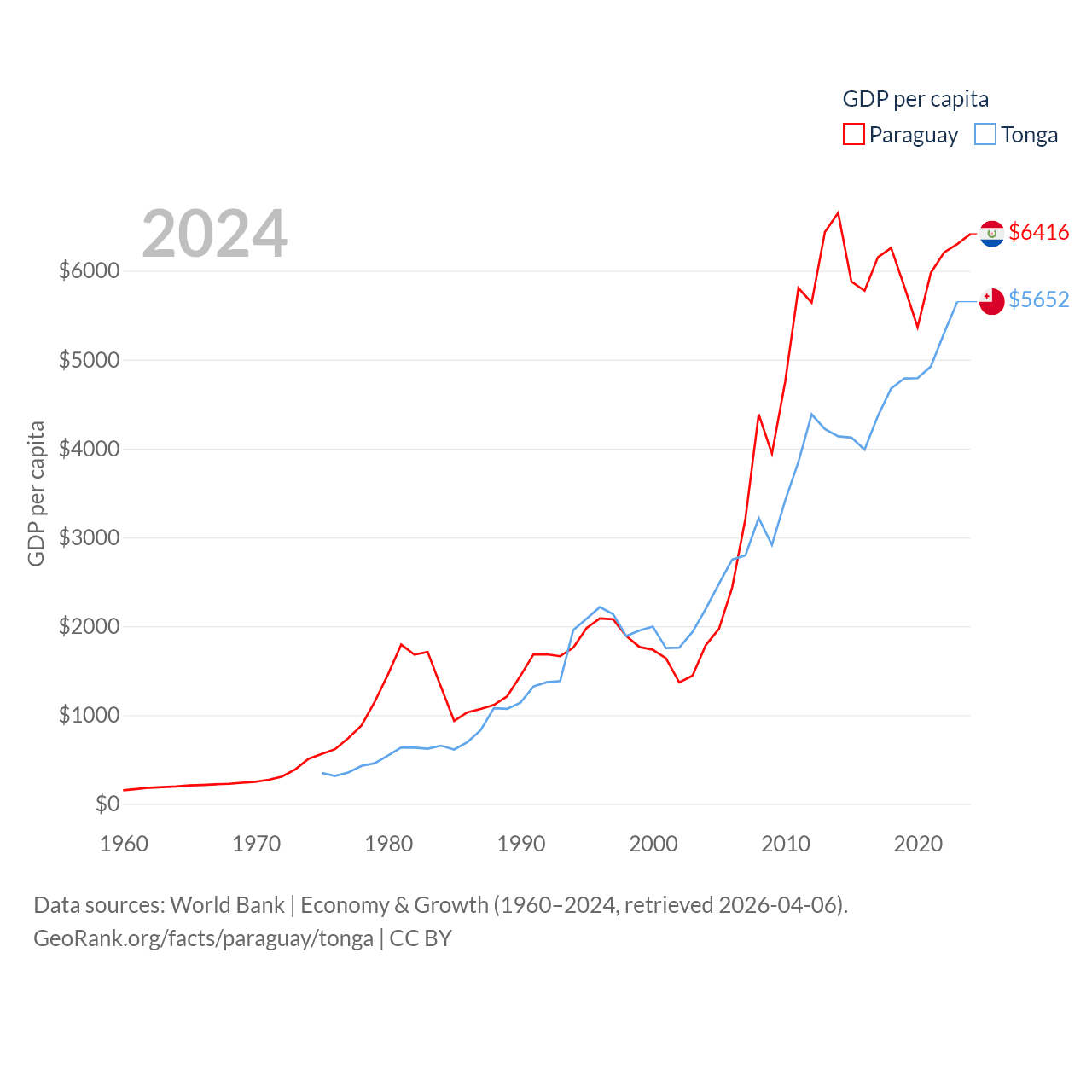 By GDP, Paraguay ranks 98/197 ($44.5B) and Tonga ranks 191/197 ($591M). By GDP per capita, Paraguay ranks 109/197 ($6,416), while Tonga ranks 115/197 ($5,652).