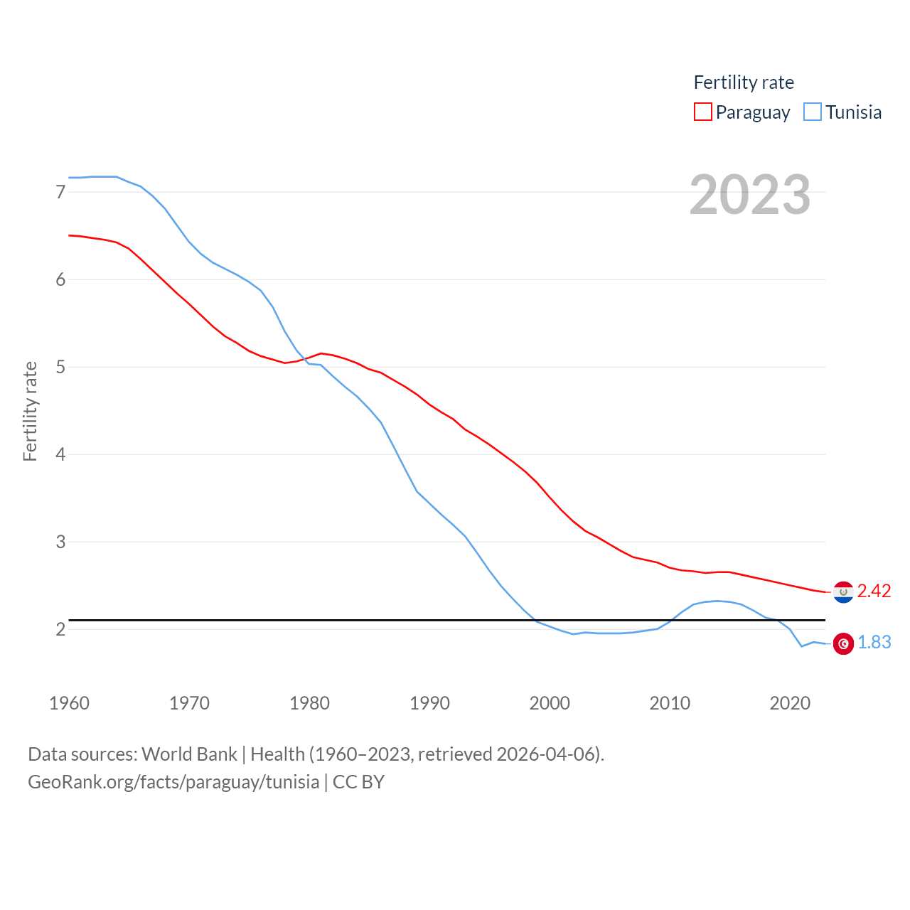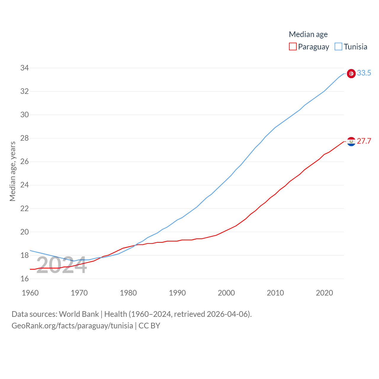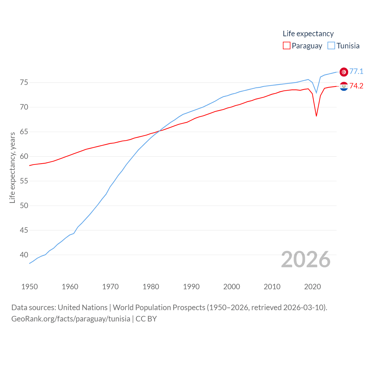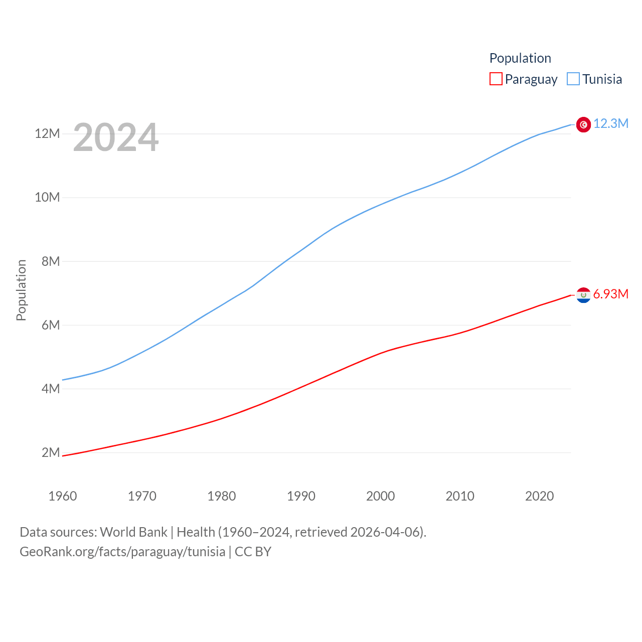Paraguay has a population of 6.93M (ranked 107/197), compared with 12.3M in Tunisia (ranked 80/197). Paraguay's land area is 152,901 sq mi versus 59,985 sq mi for Tunisia (ranked 59th vs. 91st).