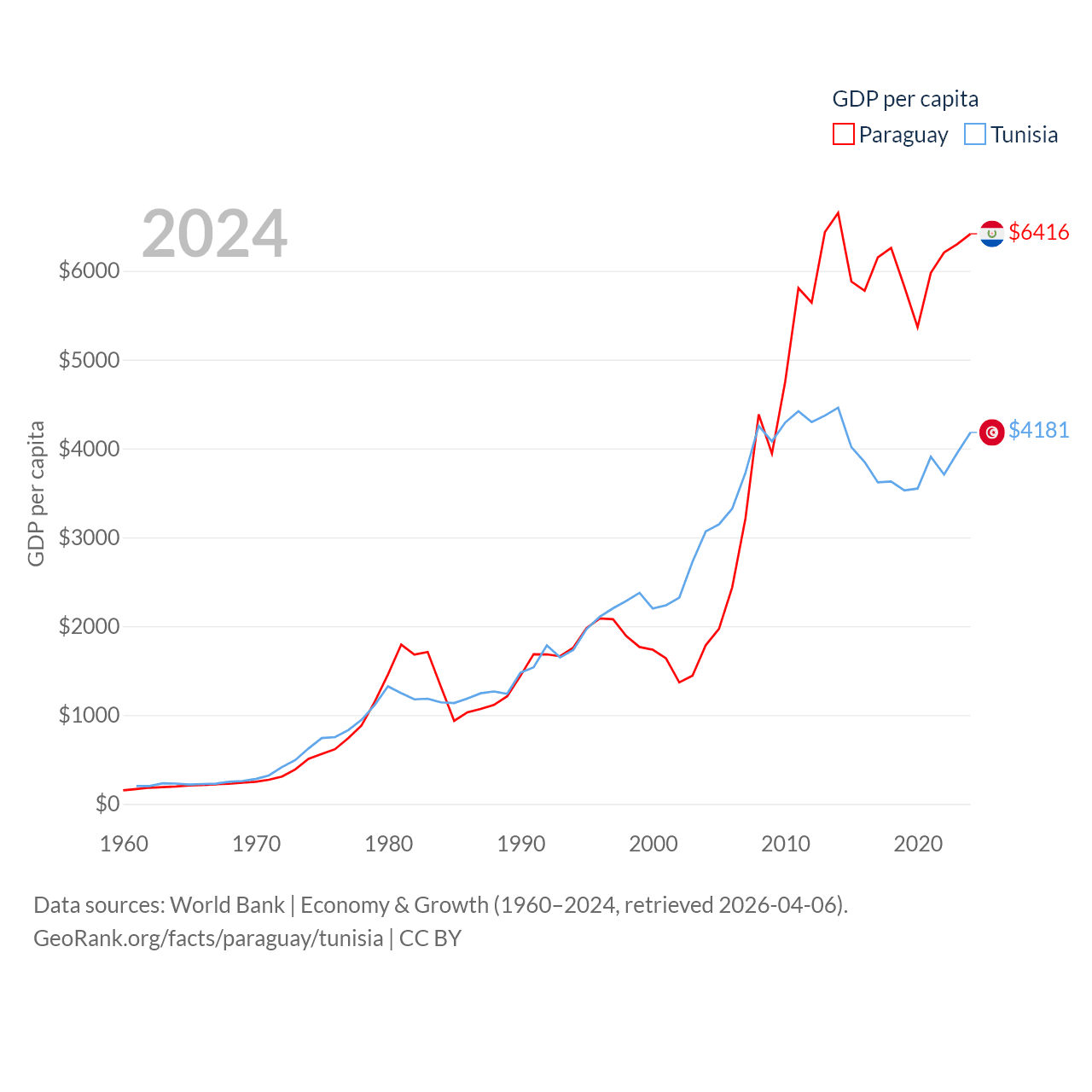 By GDP, Paraguay ranks 98/197 ($44.5B) and Tunisia ranks 93/197 ($51.3B). By GDP per capita, Paraguay ranks 109/197 ($6,416), while Tunisia ranks 129/197 ($4,181).