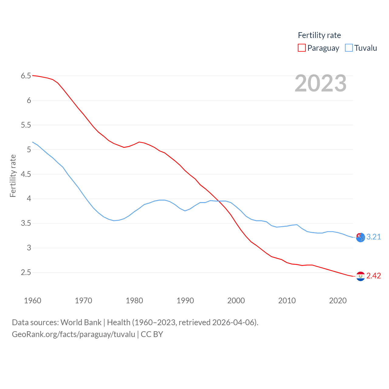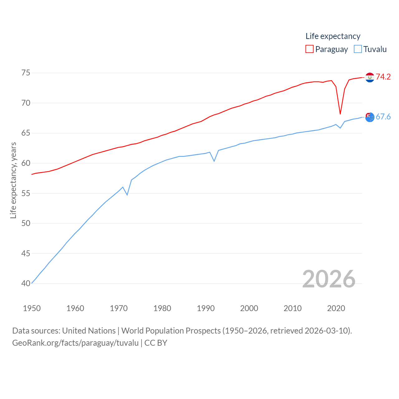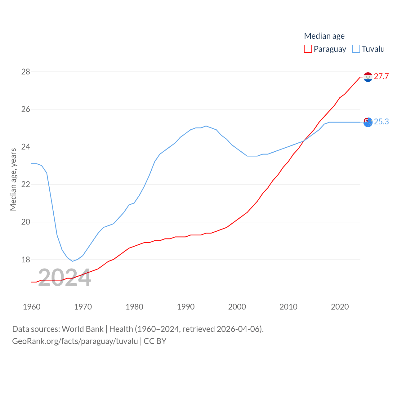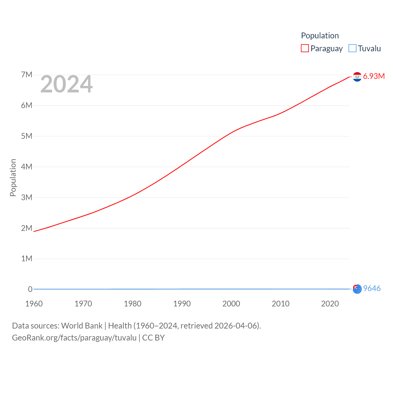 Paraguay has a population of 6.93M (ranked 107/197), compared with 9.65K in Tuvalu (ranked 196/197). Paraguay's land area is 152,901 sq mi versus 11.6 sq mi for Tuvalu (ranked 59th vs. 194th).