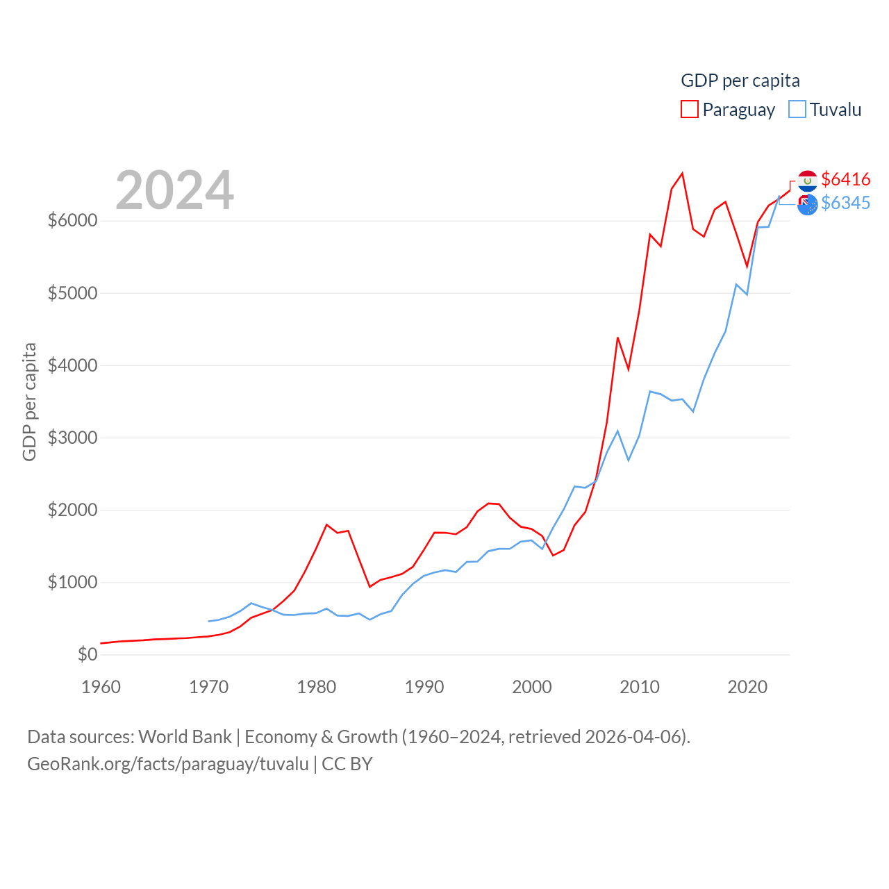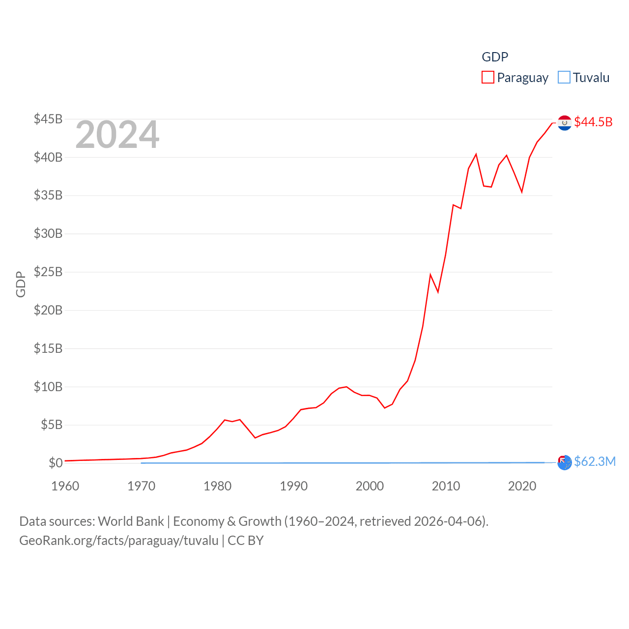 By GDP, Paraguay ranks 98/197 ($44.5B) and Tuvalu ranks 196/197 ($62.3M). By GDP per capita, Paraguay ranks 109/197 ($6,416), while Tuvalu ranks 110/197 ($6,345).