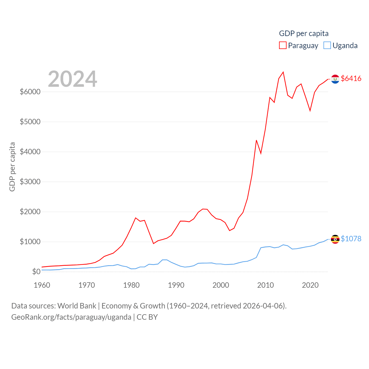 By GDP, Paraguay ranks 98/197 ($44.5B) and Uganda ranks 89/197 ($53.9B). By GDP per capita, Paraguay ranks 109/197 ($6,416), while Uganda ranks 176/197 ($1,078).