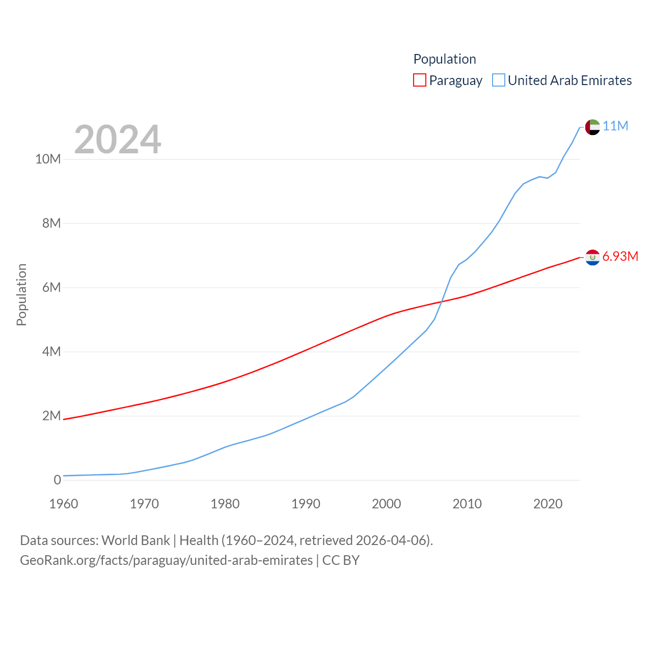Paraguay has a population of 6.93M (ranked 107/197), compared with 11M in The United Arab Emirates (ranked 86/197). Paraguay's land area is 152,901 sq mi versus 27,421 sq mi for The United Arab Emirates (ranked 59th vs. 117th).