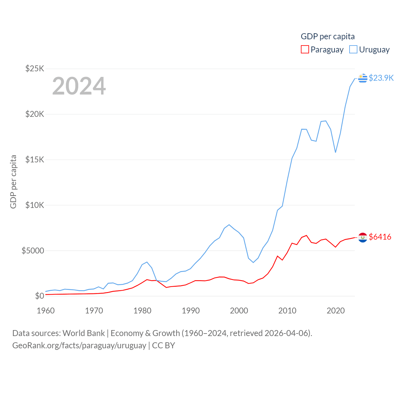 By GDP, Paraguay ranks 98/197 ($44.5B) and Uruguay ranks 81/197 ($81B). By GDP per capita, Paraguay ranks 109/197 ($6,416), while Uruguay ranks 52/197 ($23,907).