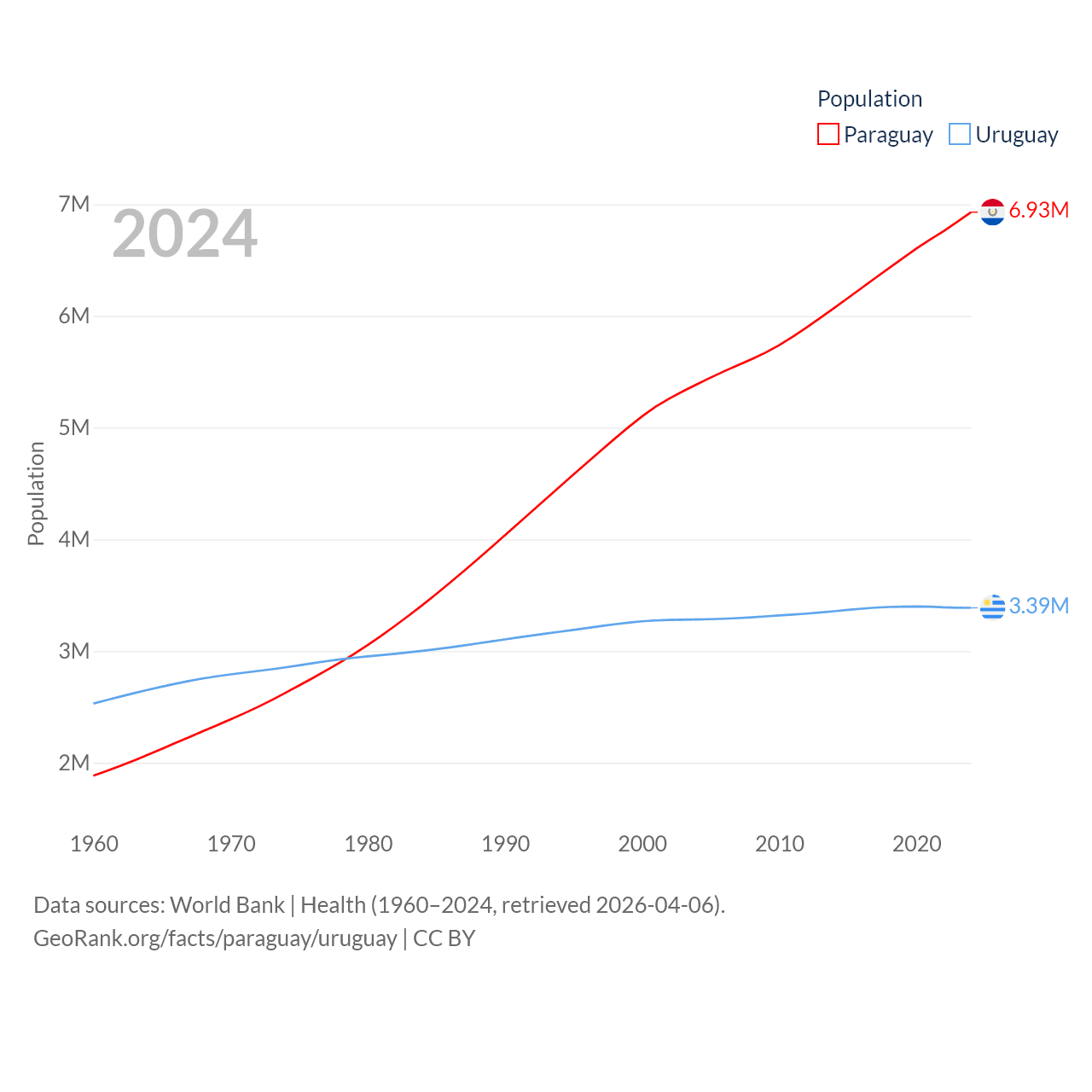 Paraguay has a population of 6.93M (ranked 107/197), compared with 3.39M in Uruguay (ranked 133/197). Paraguay's land area is 152,901 sq mi versus 67,576 sq mi for Uruguay (ranked 59th vs. 89th).