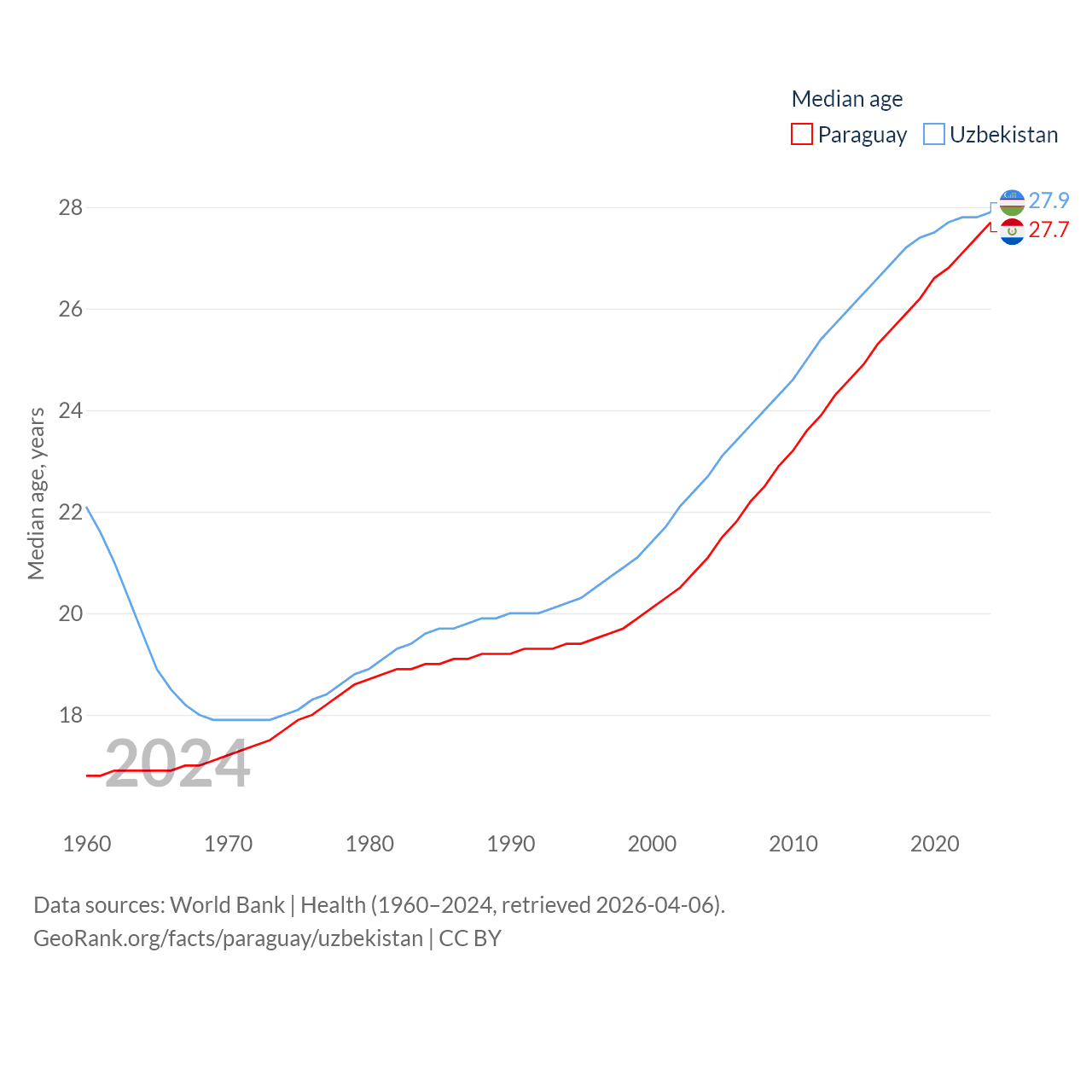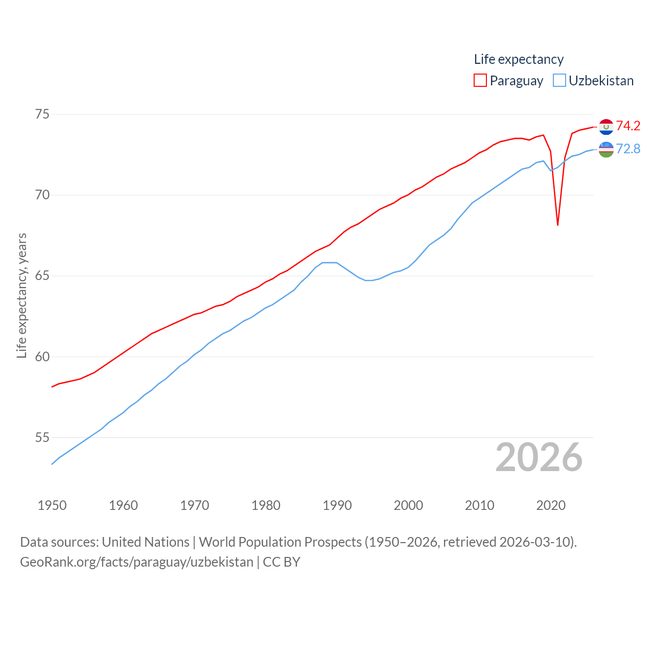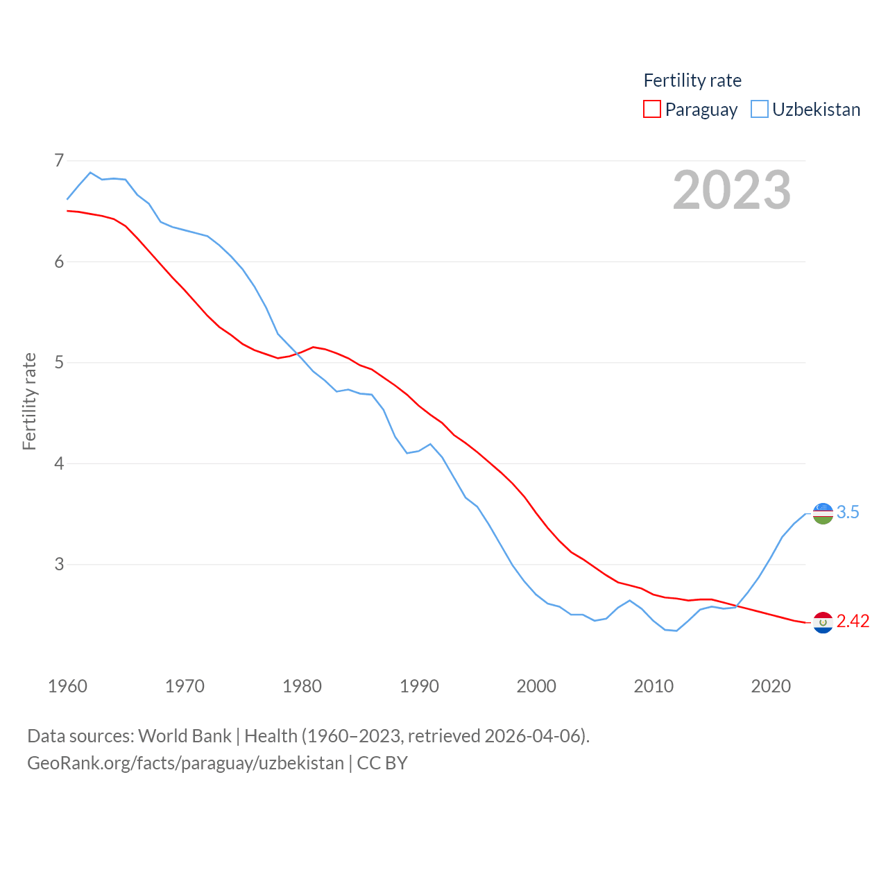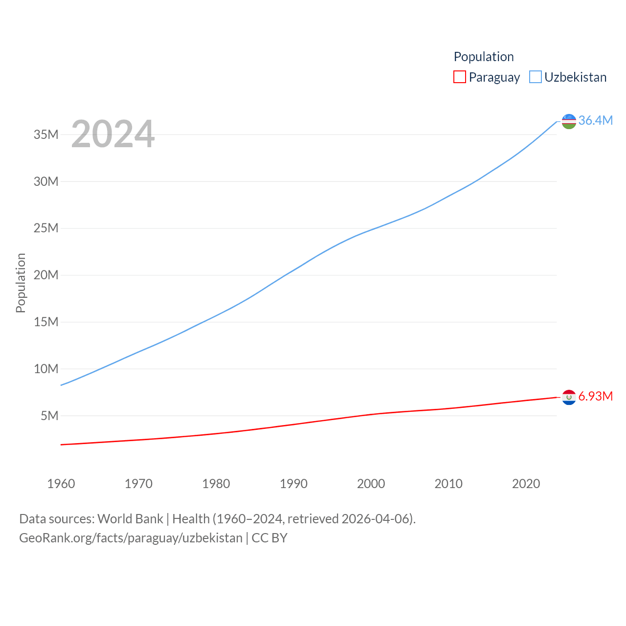 Paraguay has a population of 6.93M (ranked 107/197), compared with 36.4M in Uzbekistan (ranked 43/197). Paraguay's land area is 152,901 sq mi versus 170,136 sq mi for Uzbekistan (ranked 59th vs. 56th).