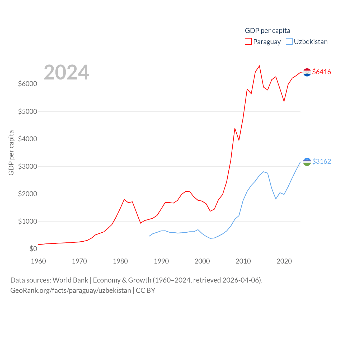 By GDP, Paraguay ranks 98/197 ($44.5B) and Uzbekistan ranks 66/197 ($115B). By GDP per capita, Paraguay ranks 109/197 ($6,416), while Uzbekistan ranks 139/197 ($3,162).