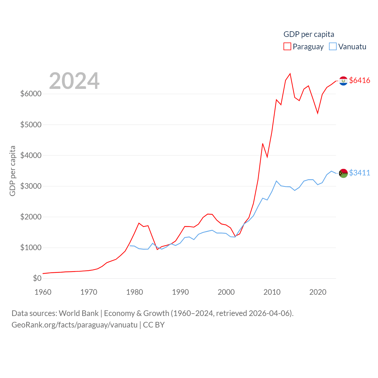 By GDP, Paraguay ranks 98/197 ($44.5B) and Vanuatu ranks 188/197 ($1.12B). By GDP per capita, Paraguay ranks 109/197 ($6,416), while Vanuatu ranks 137/197 ($3,411).