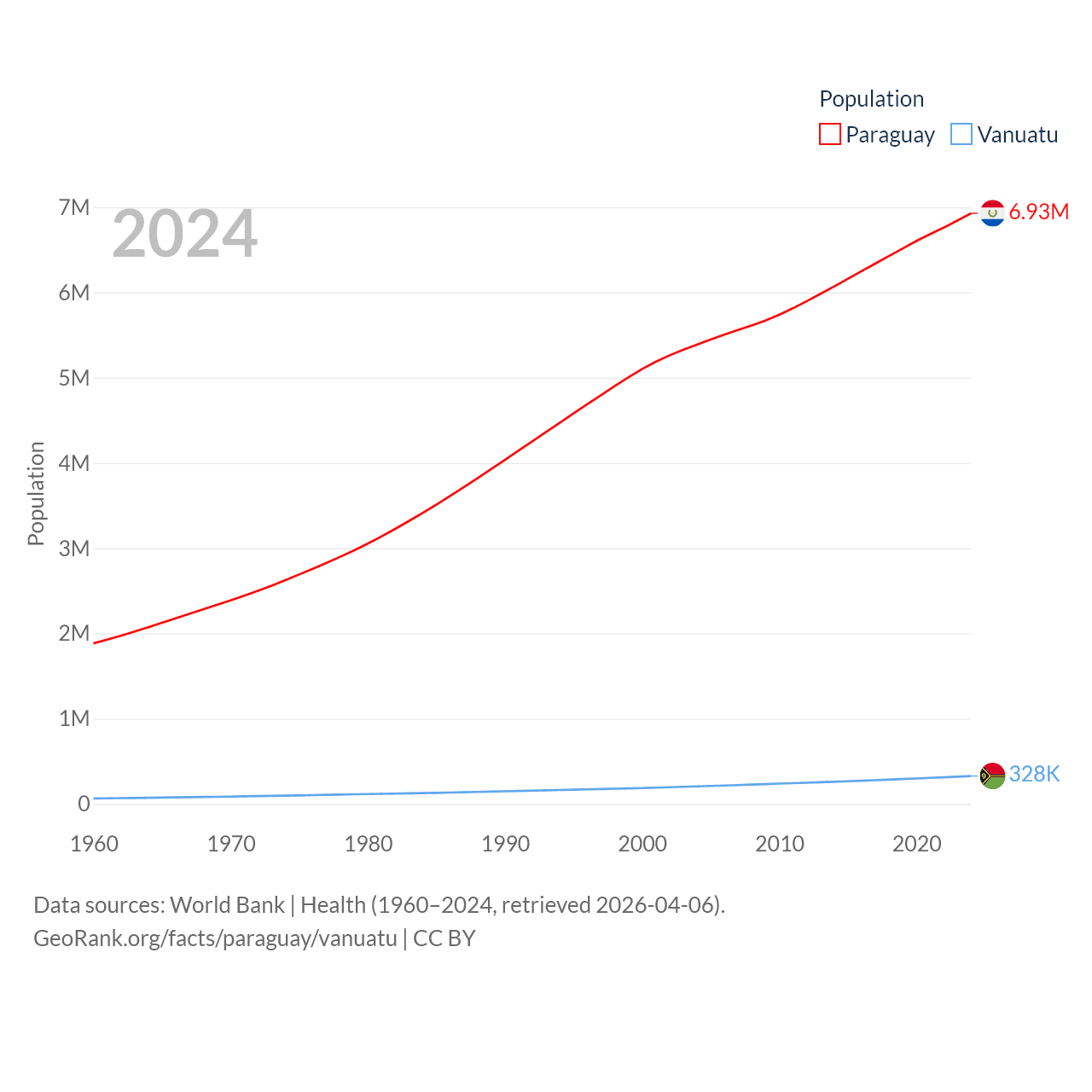 Paraguay has a population of 6.93M (ranked 107/197), compared with 328K in Vanuatu (ranked 174/197). Paraguay's land area is 152,901 sq mi versus 4,707 sq mi for Vanuatu (ranked 59th vs. 157th).