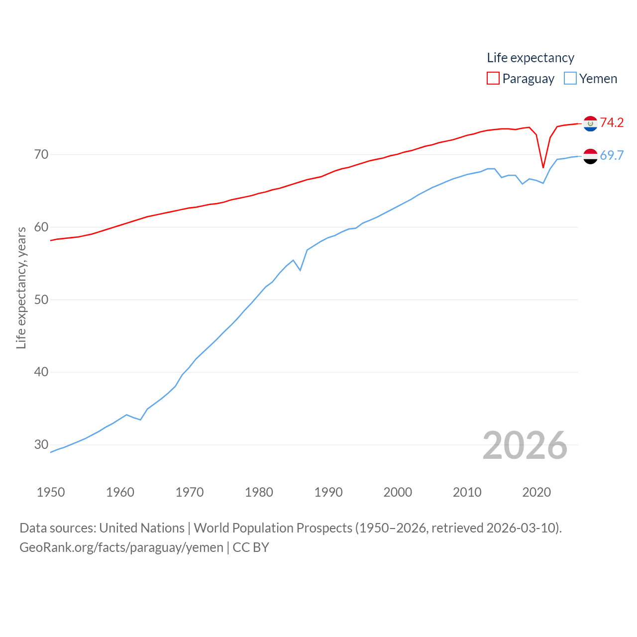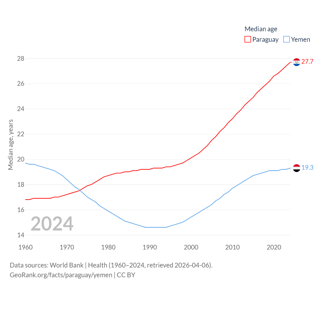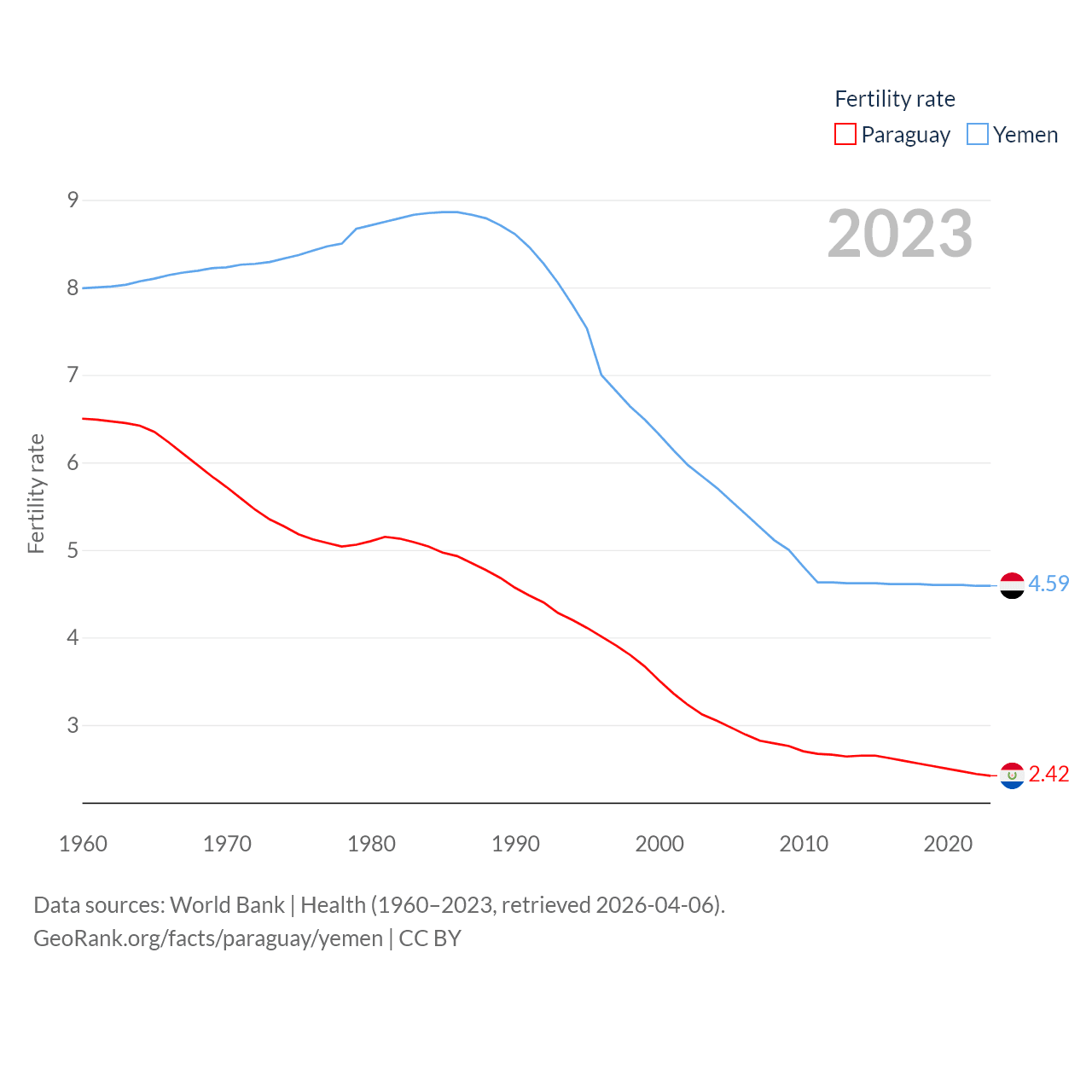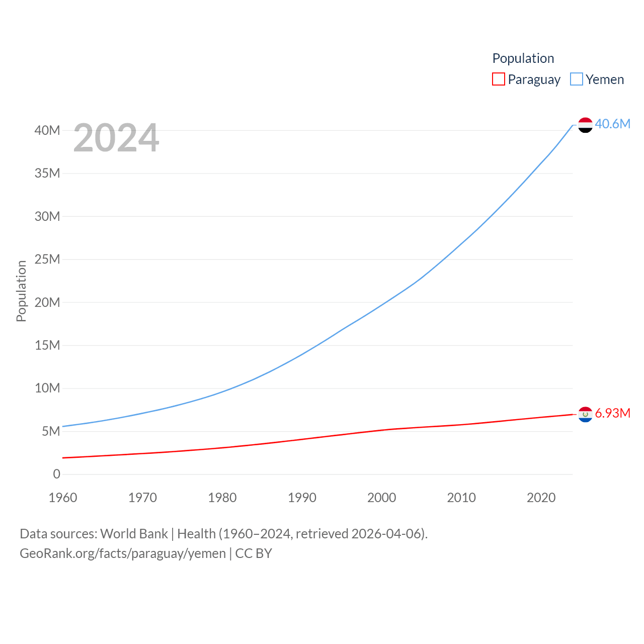 Paraguay has a population of 6.93M (ranked 107/197), compared with 40.6M in Yemen (ranked 38/197). Paraguay's land area is 152,901 sq mi versus 203,850 sq mi for Yemen (ranked 59th vs. 49th).