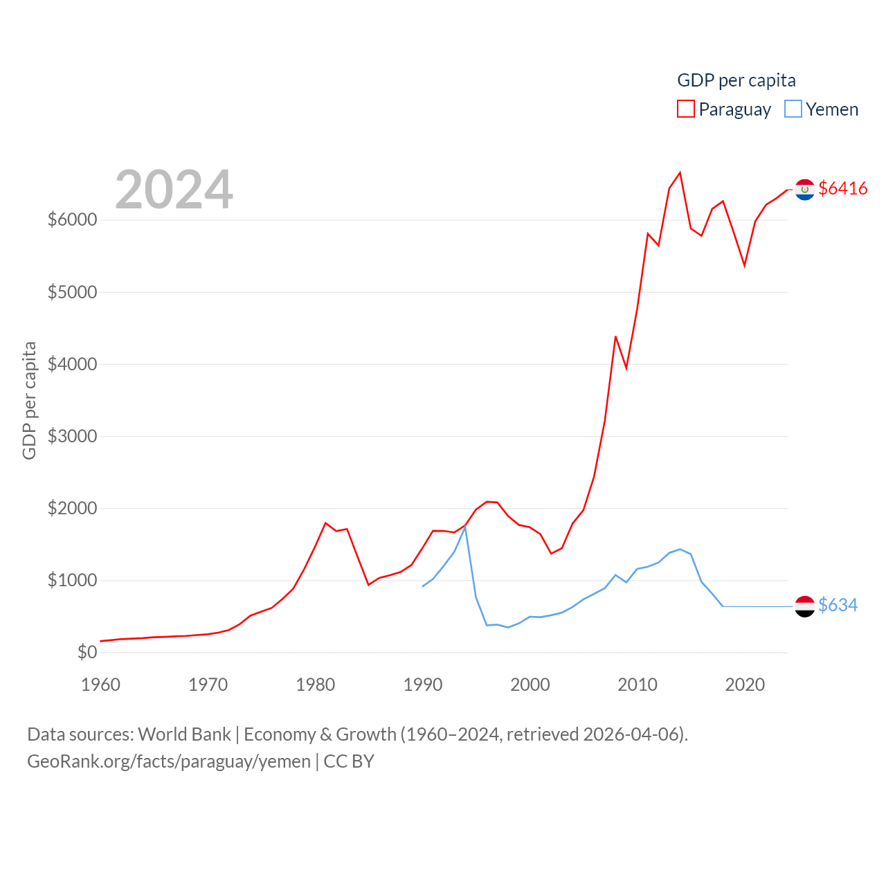 By GDP, Paraguay ranks 98/197 ($44.5B) and Yemen ranks 125/197 ($21.6B). By GDP per capita, Paraguay ranks 109/197 ($6,416), while Yemen ranks 191/197 ($634).