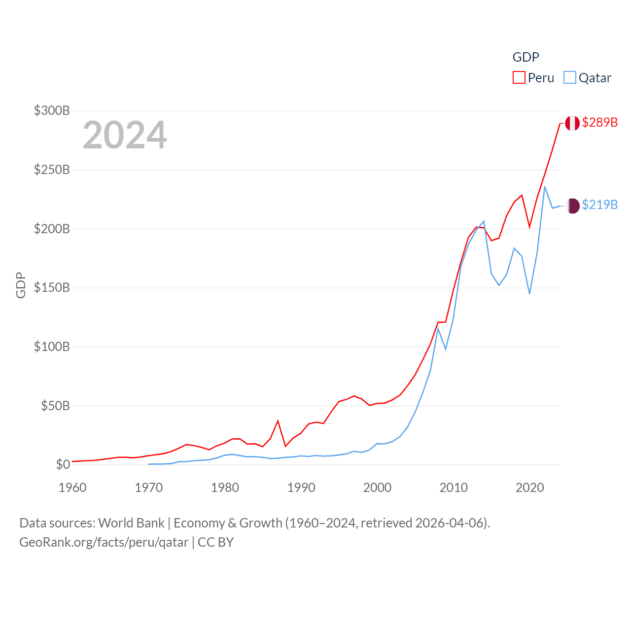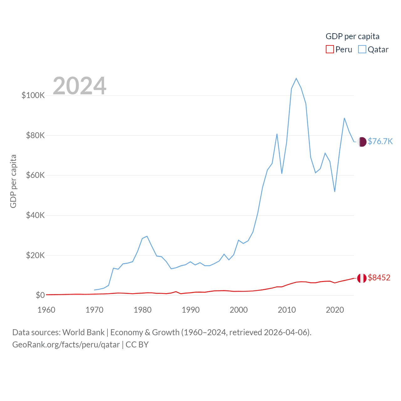 By GDP, Peru ranks 49/197 ($289B) and Qatar ranks 56/197 ($219B). By GDP per capita, Peru ranks 91/197 ($8,452), while Qatar ranks 11/197 ($76,689).