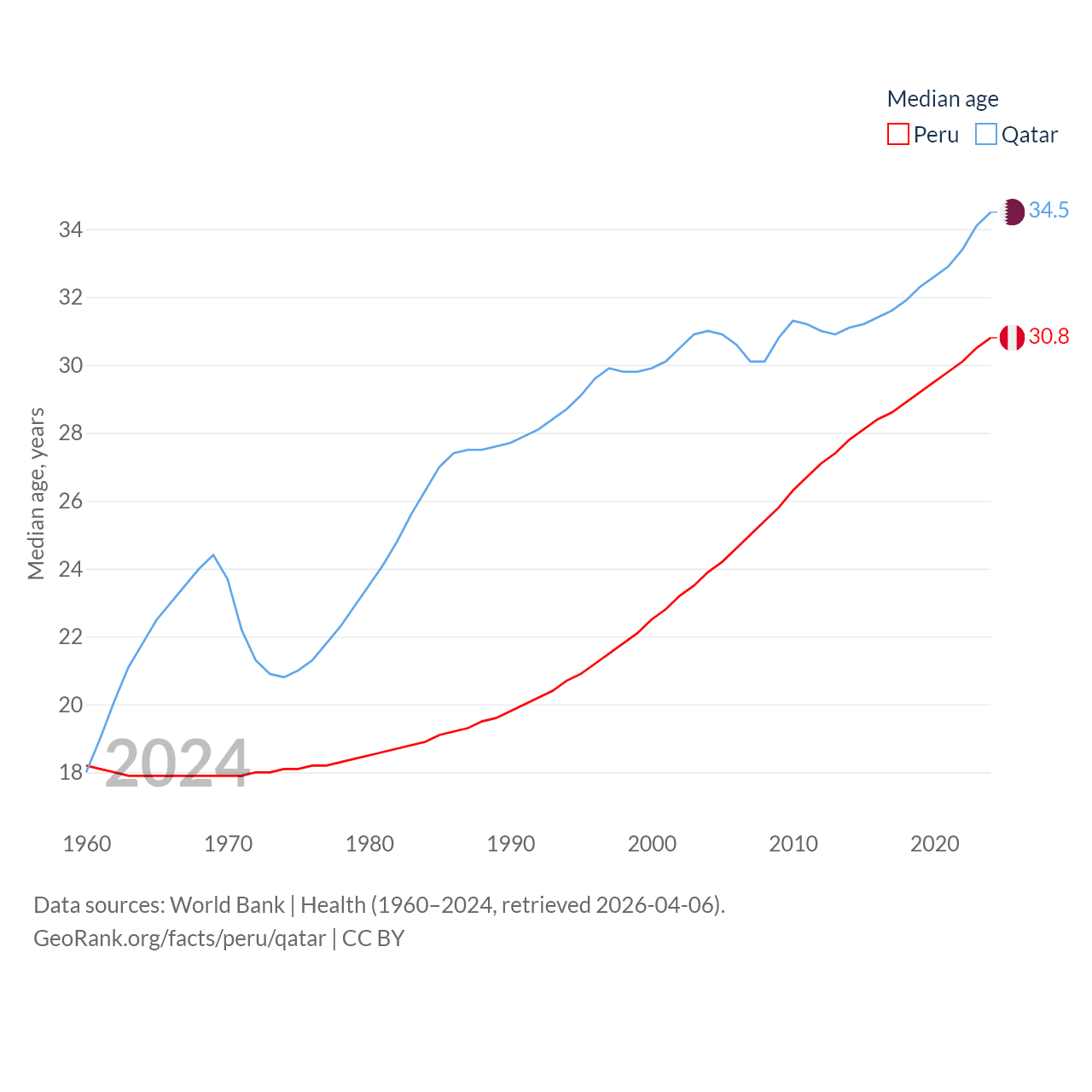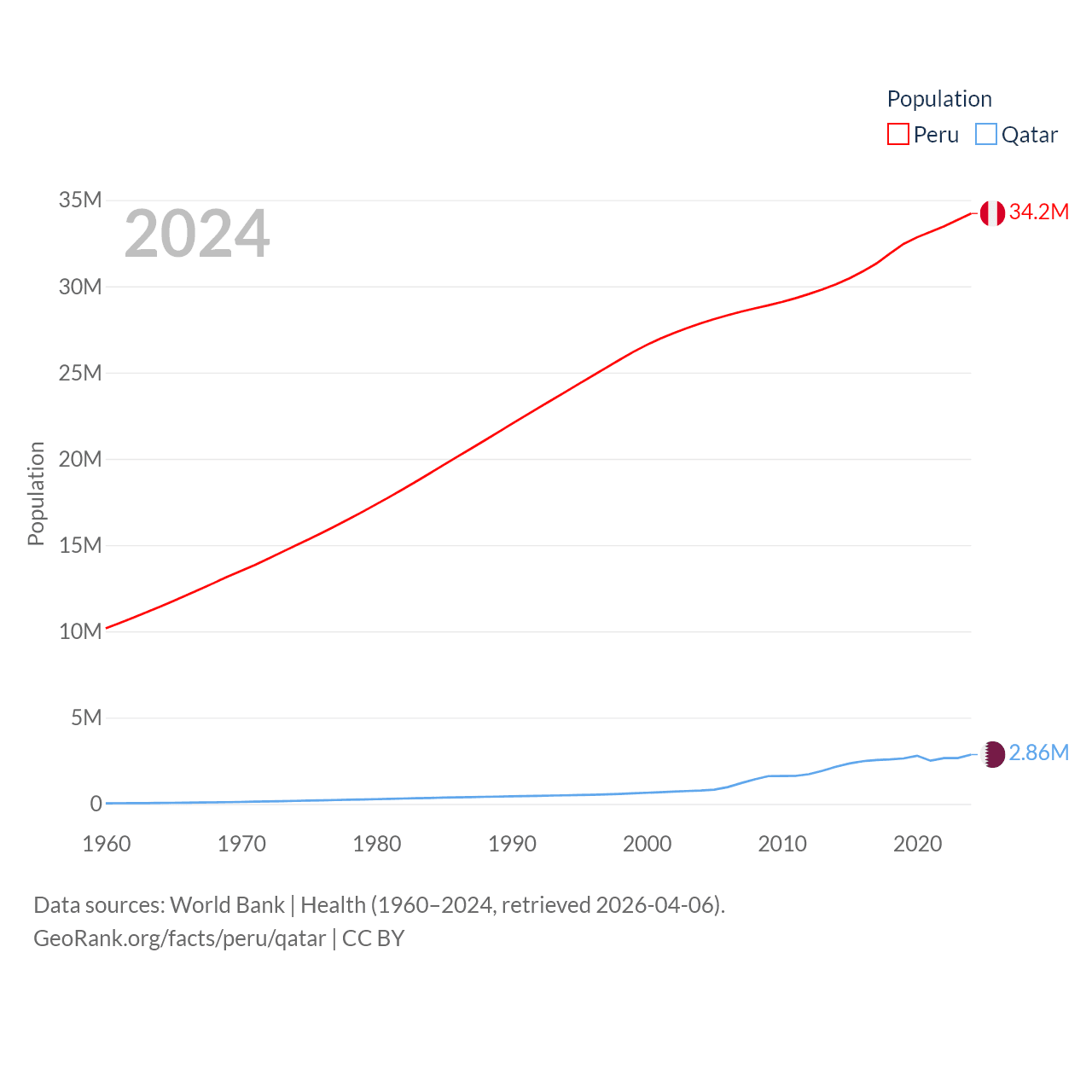 Peru has a population of 34.2M (ranked 48/197), compared with 2.86M in Qatar (ranked 138/197). Peru's land area is 494,211 sq mi versus 4,436 sq mi for Qatar (ranked 19th vs. 158th).