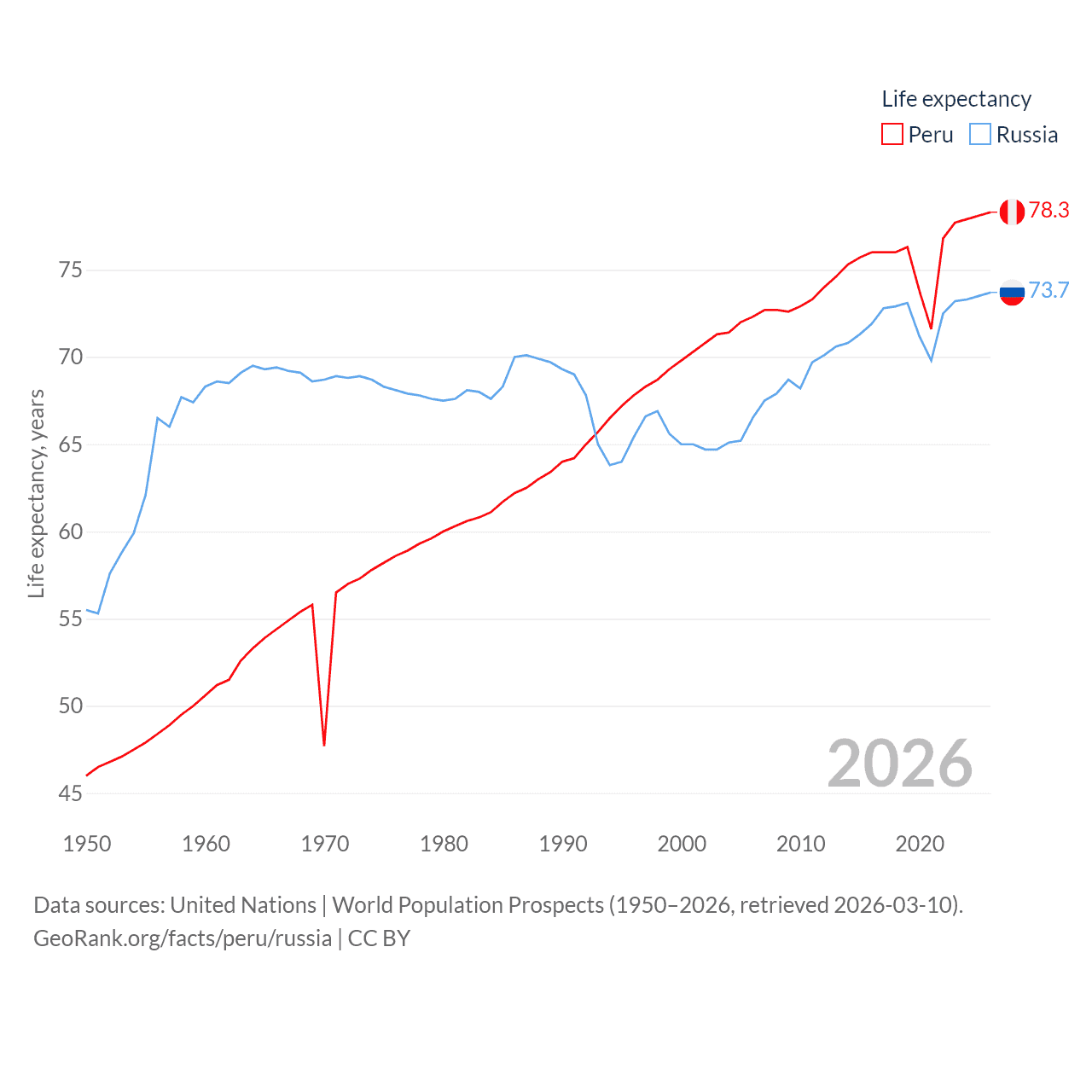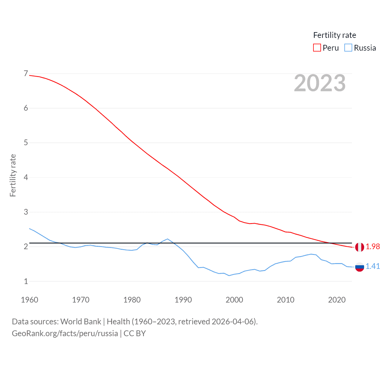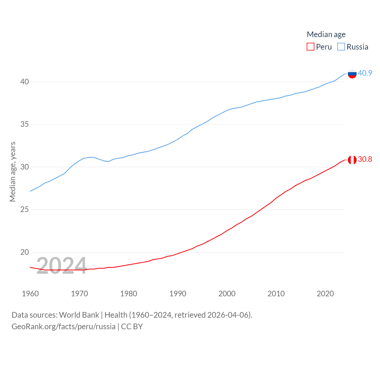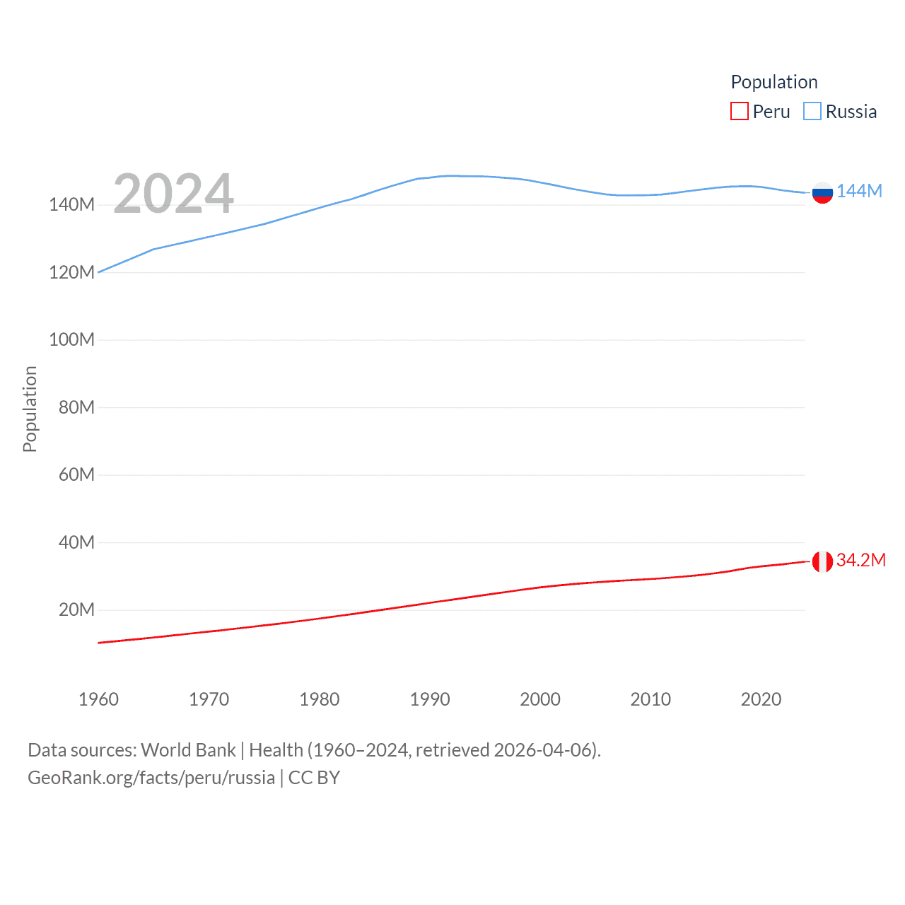 Peru has a population of 34.2M (ranked 48/197), compared with 144M in Russia (ranked 9/197). Peru's land area is 494,211 sq mi versus 6,323,145 sq mi for Russia (ranked 19th vs. 1st).