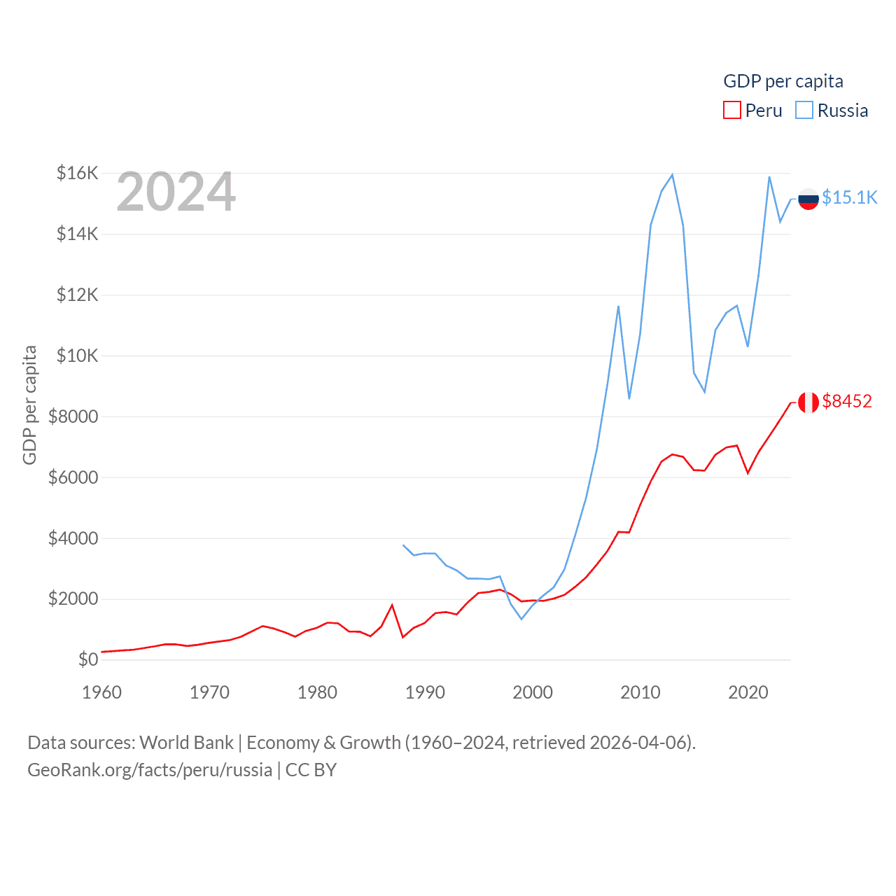 By GDP, Peru ranks 49/197 ($289B) and Russia ranks 11/197 ($2.17T). By GDP per capita, Peru ranks 91/197 ($8,452), while Russia ranks 68/197 ($15,145).