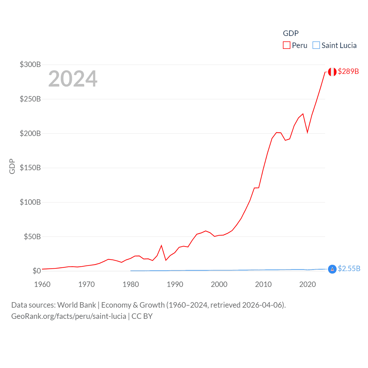 By GDP, Peru ranks 49/197 ($289B) and Saint Lucia ranks 173/197 ($2.55B). By GDP per capita, Peru ranks 91/197 ($8,452), while Saint Lucia ranks 70/197 ($14,182).