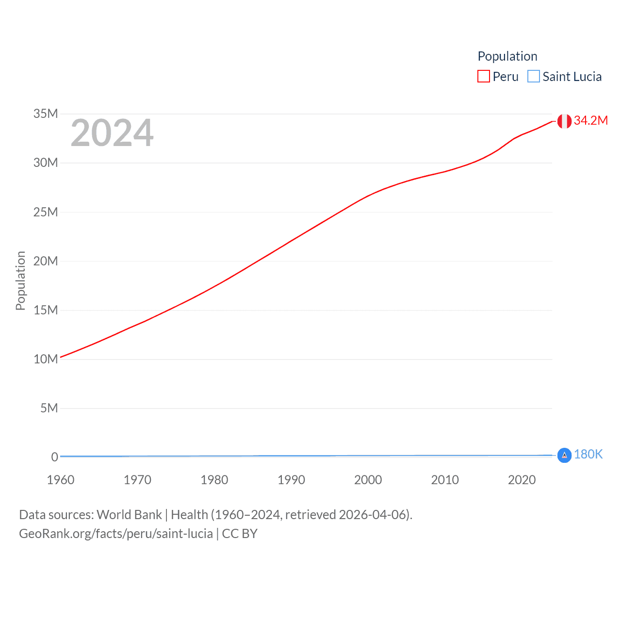 Peru has a population of 34.2M (ranked 48/197), compared with 180K in Saint Lucia (ranked 178/197). Peru's land area is 494,211 sq mi versus 235.5 sq mi for Saint Lucia (ranked 19th vs. 178th).