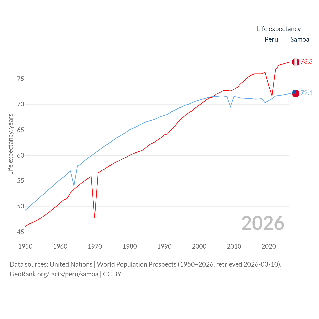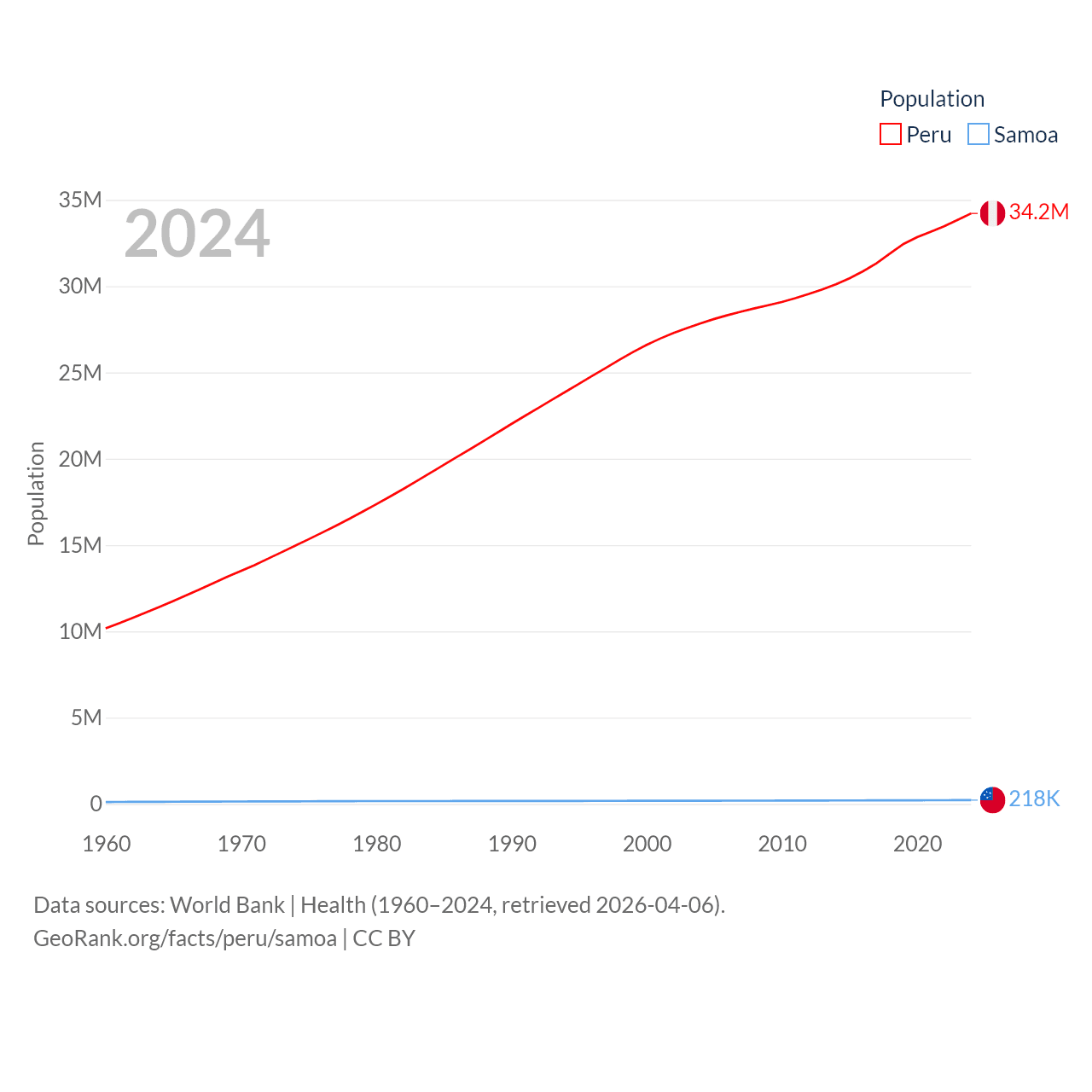 Peru has a population of 34.2M (ranked 48/197), compared with 218K in Samoa (ranked 177/197). Peru's land area is 494,211 sq mi versus 1,073 sq mi for Samoa (ranked 19th vs. 168th).