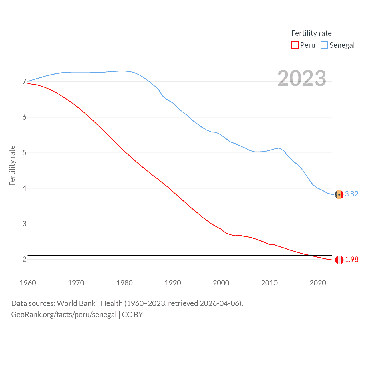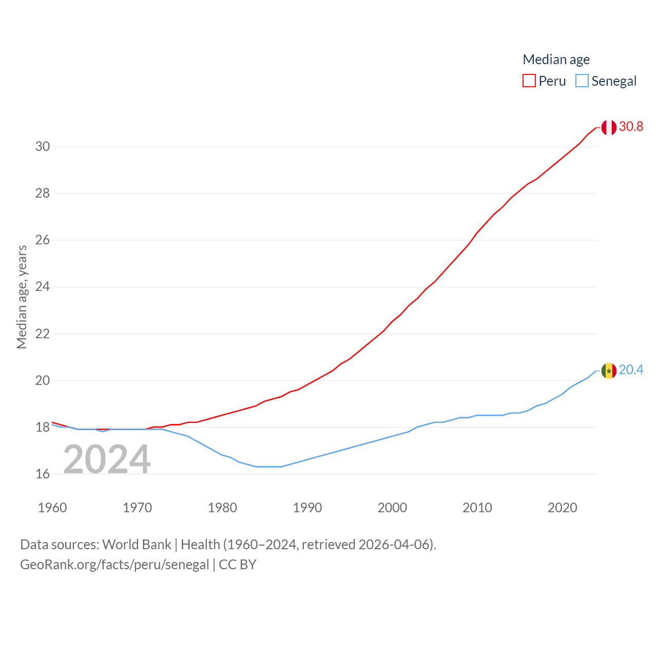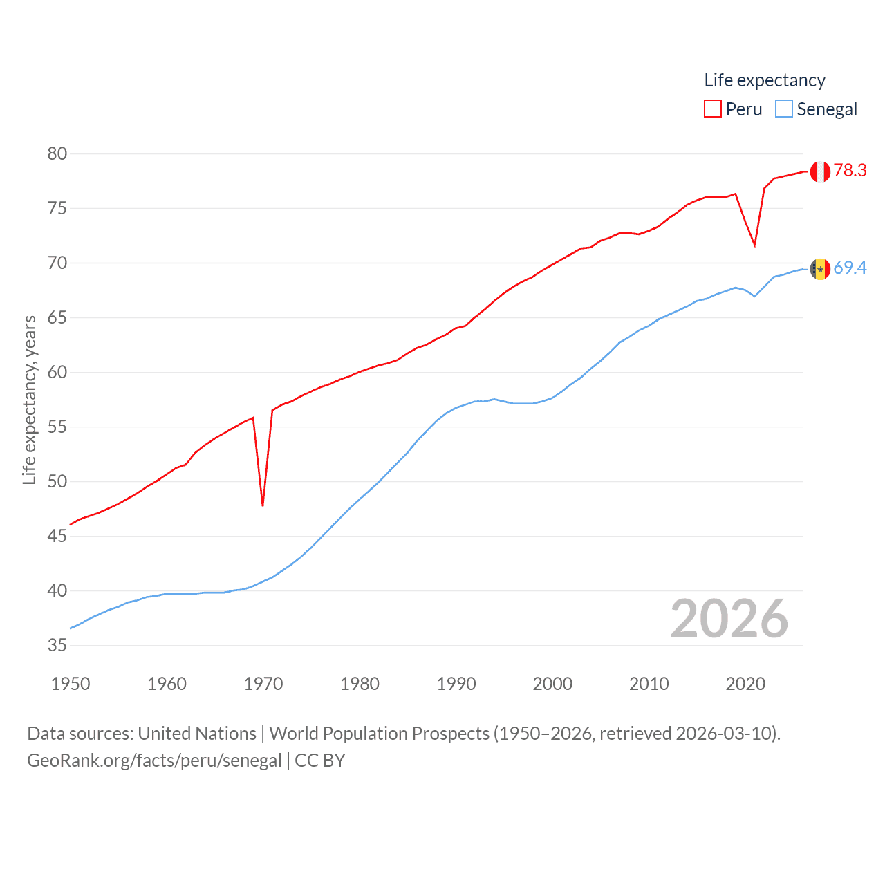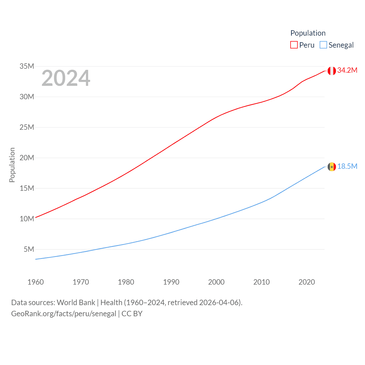 Peru has a population of 34.2M (ranked 48/197), compared with 18.5M in Senegal (ranked 69/197). Peru's land area is 494,211 sq mi versus 74,336 sq mi for Senegal (ranked 19th vs. 85th).