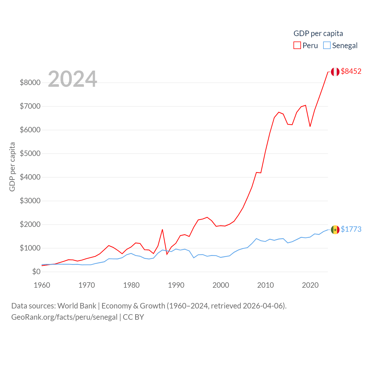 By GDP, Peru ranks 49/197 ($289B) and Senegal ranks 109/197 ($32.8B). By GDP per capita, Peru ranks 91/197 ($8,452), while Senegal ranks 159/197 ($1,773).
