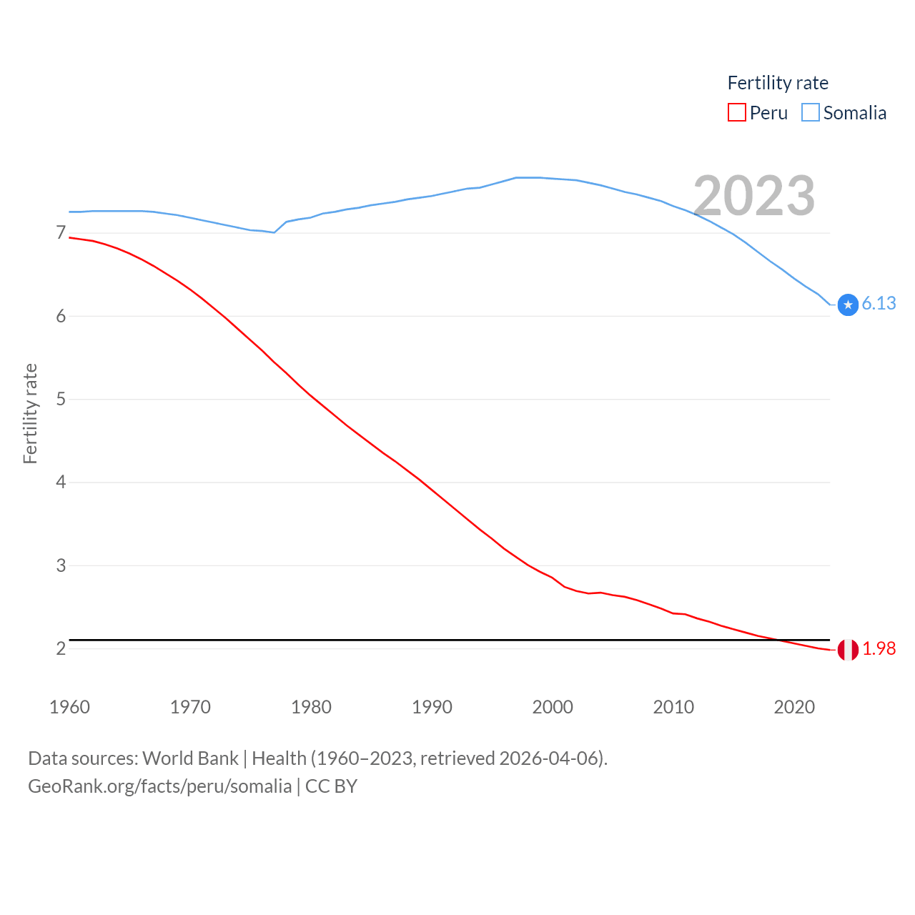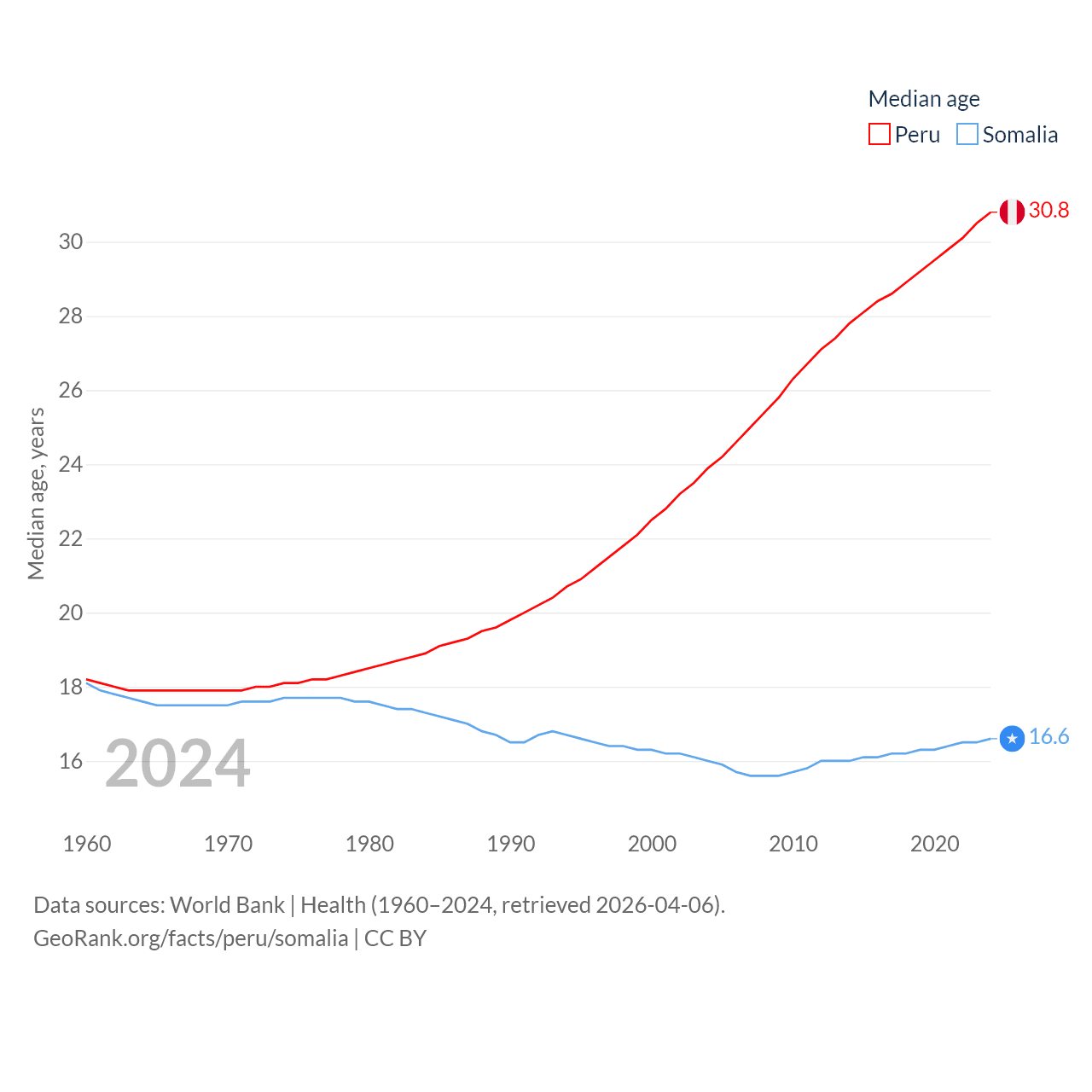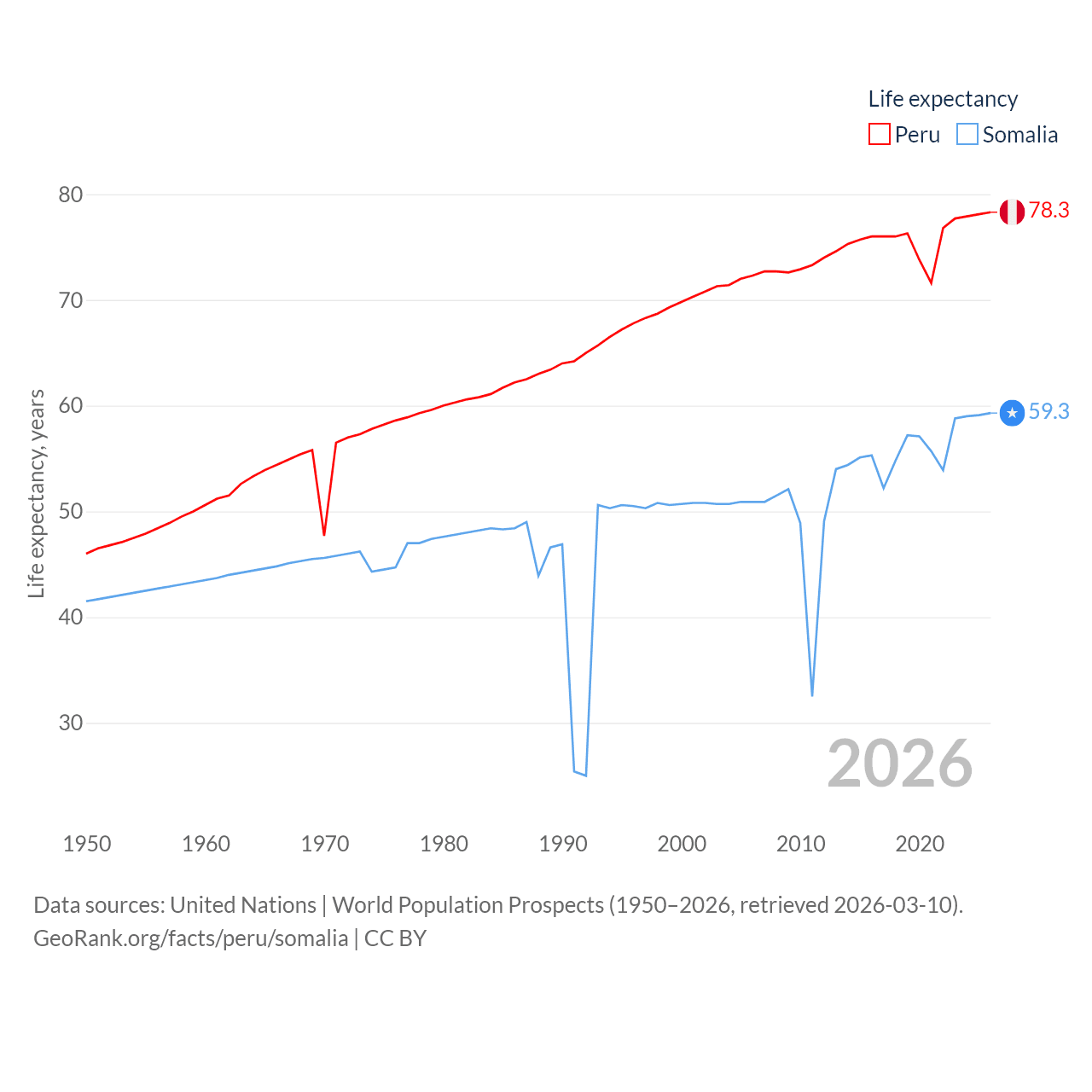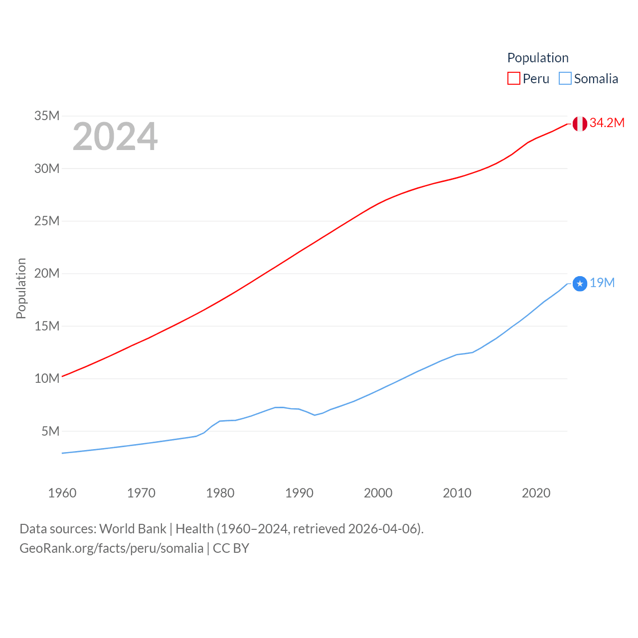Peru has a population of 34.2M (ranked 48/197), compared with 19M in Somalia (ranked 68/197). Peru's land area is 494,211 sq mi versus 242,217 sq mi for Somalia (ranked 19th vs. 42nd).