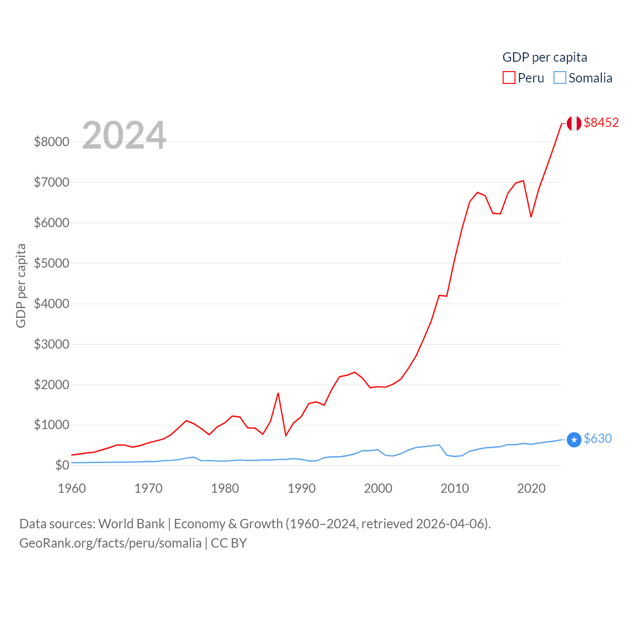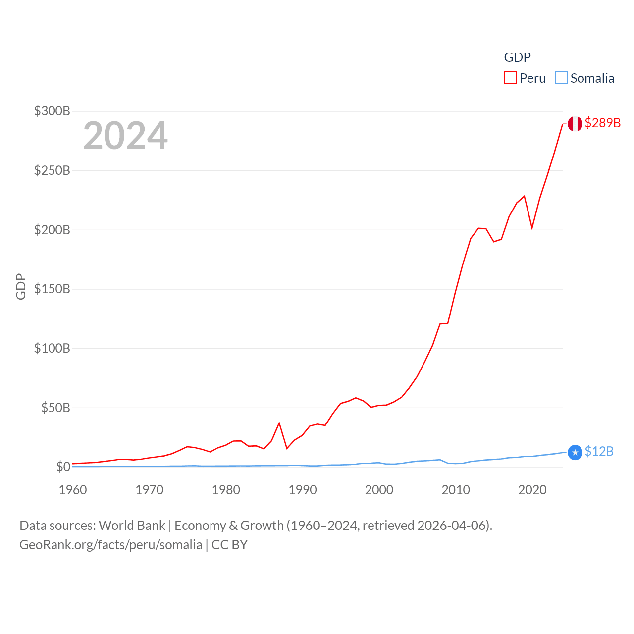 By GDP, Peru ranks 49/197 ($289B) and Somalia ranks 150/197 ($12B). By GDP per capita, Peru ranks 91/197 ($8,452), while Somalia ranks 192/197 ($630).