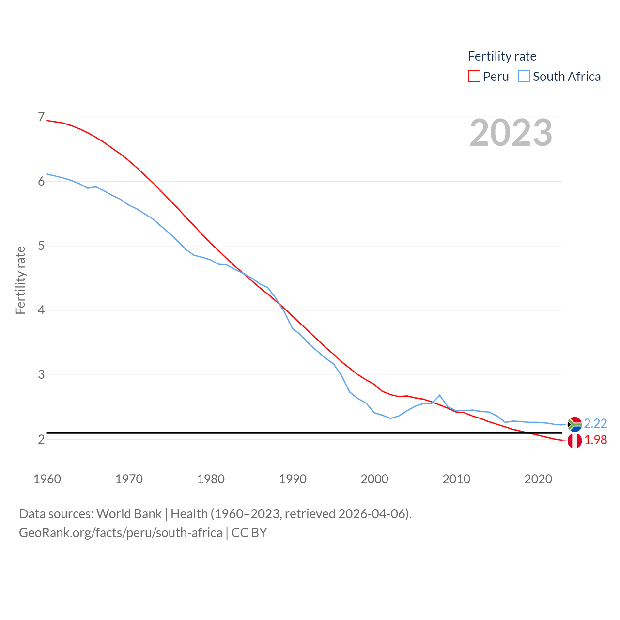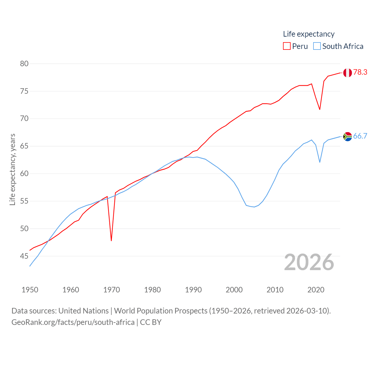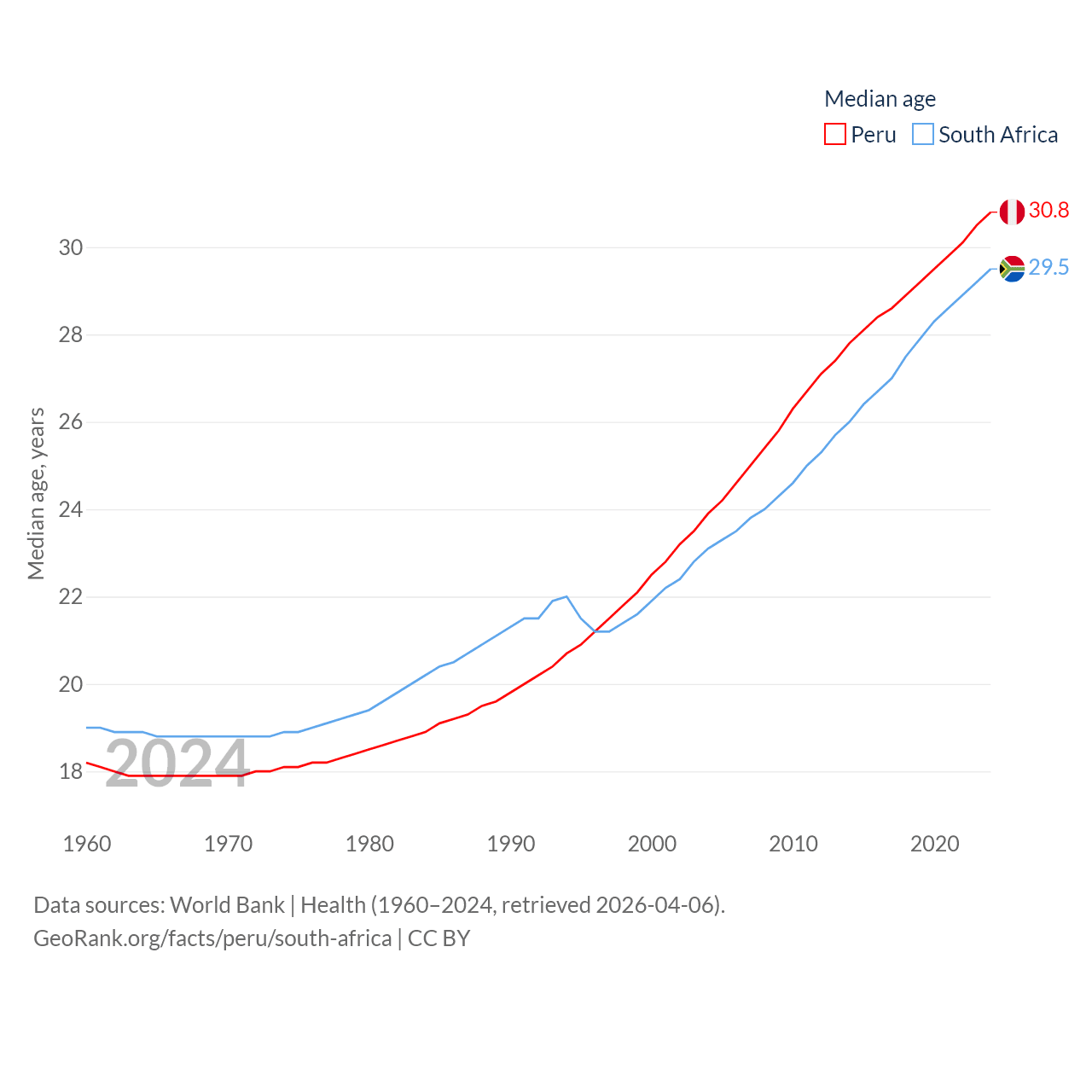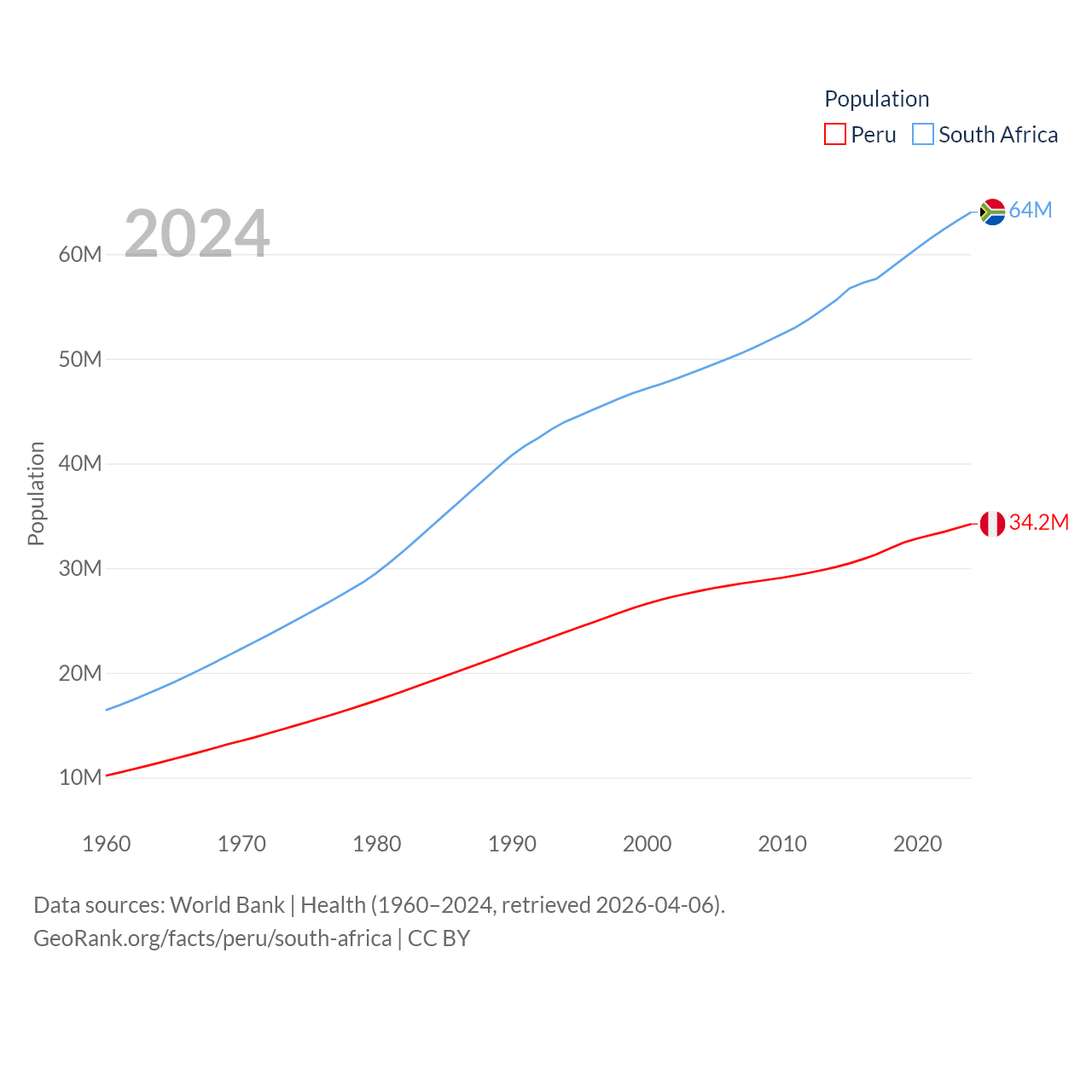 Peru has a population of 34.2M (ranked 48/197), compared with 64M in South Africa (ranked 24/197). Peru's land area is 494,211 sq mi versus 468,377 sq mi for South Africa (ranked 19th vs. 24th).