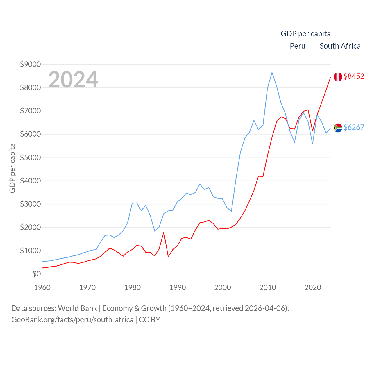 By GDP, Peru ranks 49/197 ($289B) and South Africa ranks 40/197 ($401B). By GDP per capita, Peru ranks 91/197 ($8,452), while South Africa ranks 111/197 ($6,267).