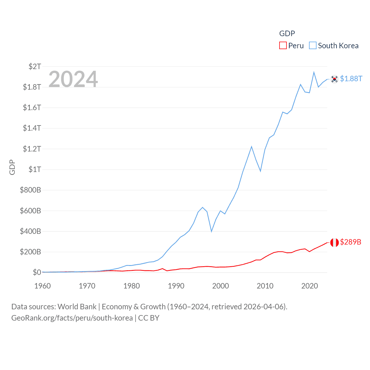 By GDP, Peru ranks 49/197 ($289B) and South Korea ranks 12/197 ($1.88T). By GDP per capita, Peru ranks 91/197 ($8,452), while South Korea ranks 31/197 ($36,239).