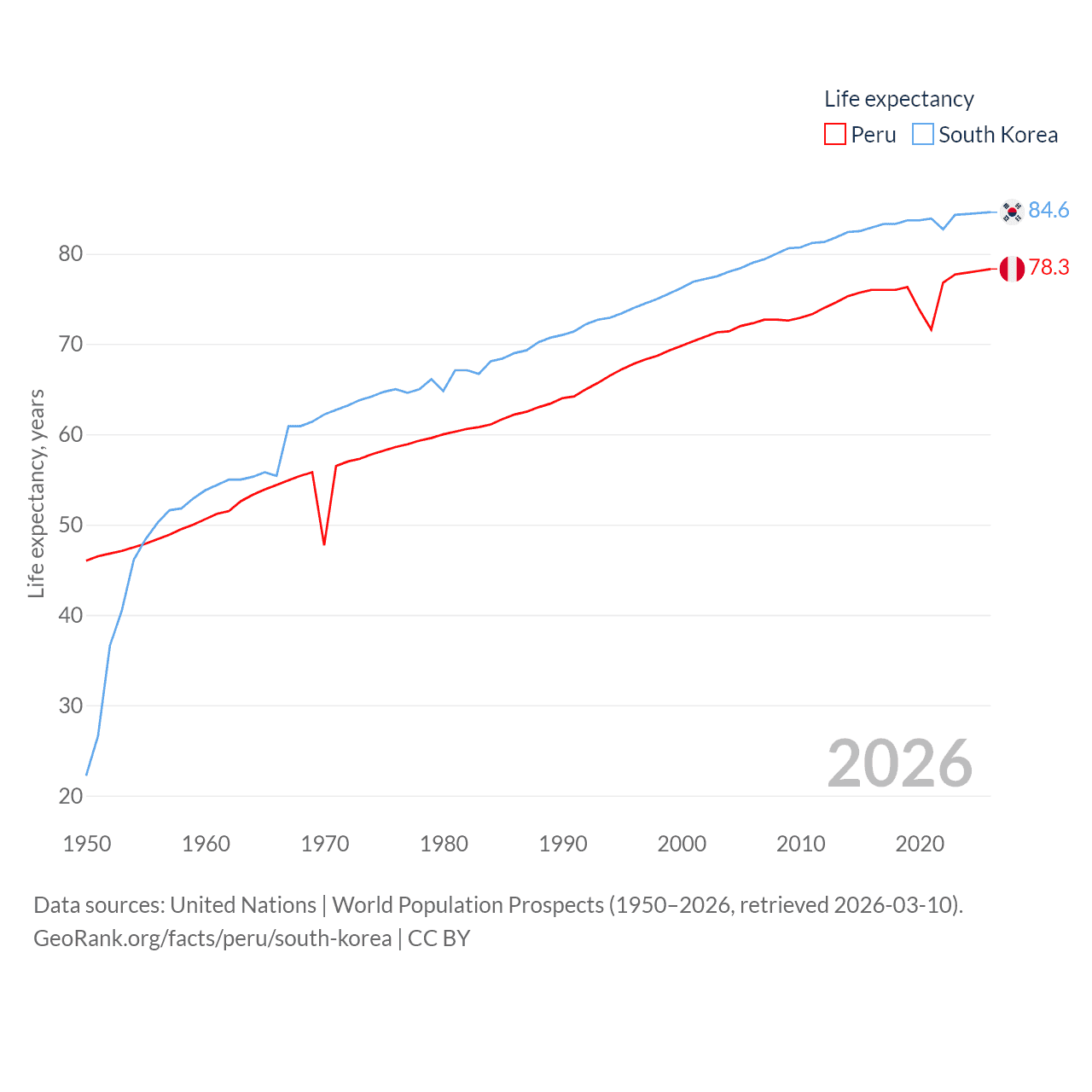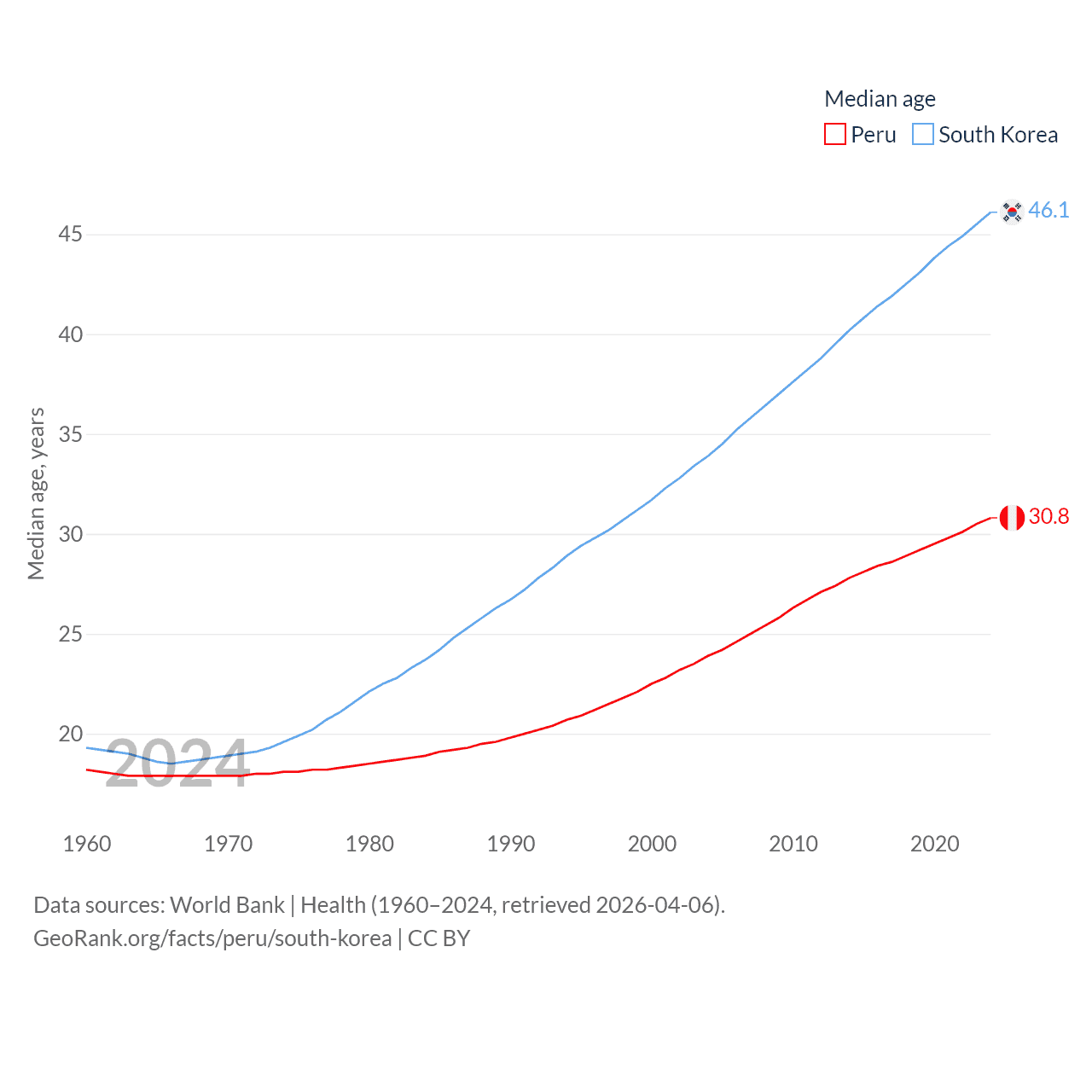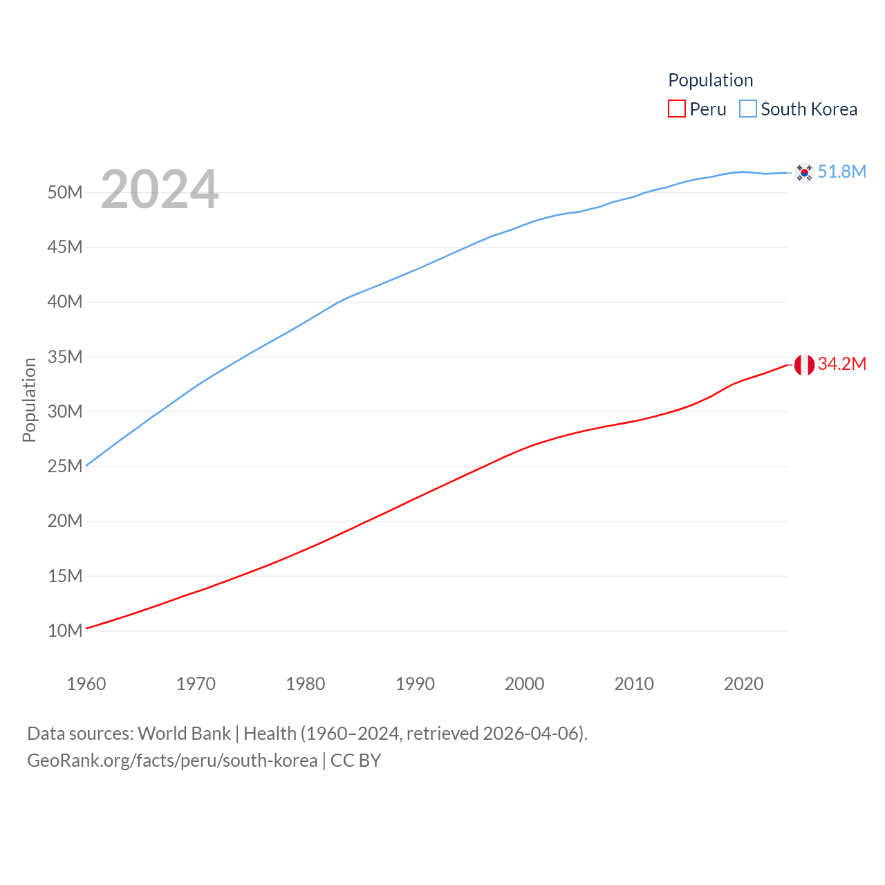 Peru has a population of 34.2M (ranked 48/197), compared with 51.8M in South Korea (ranked 29/197). Peru's land area is 494,211 sq mi versus 37,684 sq mi for South Korea (ranked 19th vs. 105th).