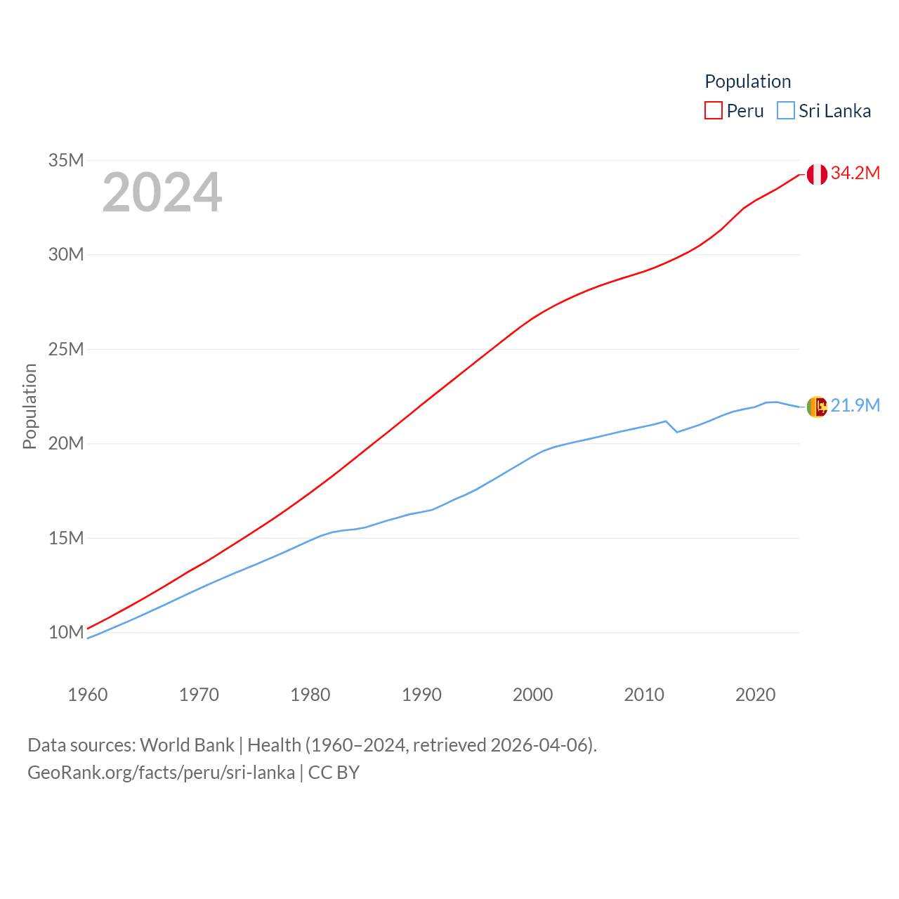 Peru has a population of 34.2M (ranked 48/197), compared with 21.9M in Sri Lanka (ranked 61/197). Peru's land area is 494,211 sq mi versus 23,884 sq mi for Sri Lanka (ranked 19th vs. 122nd).