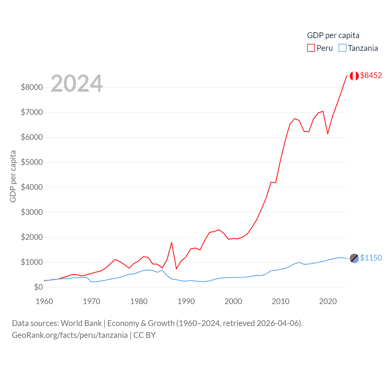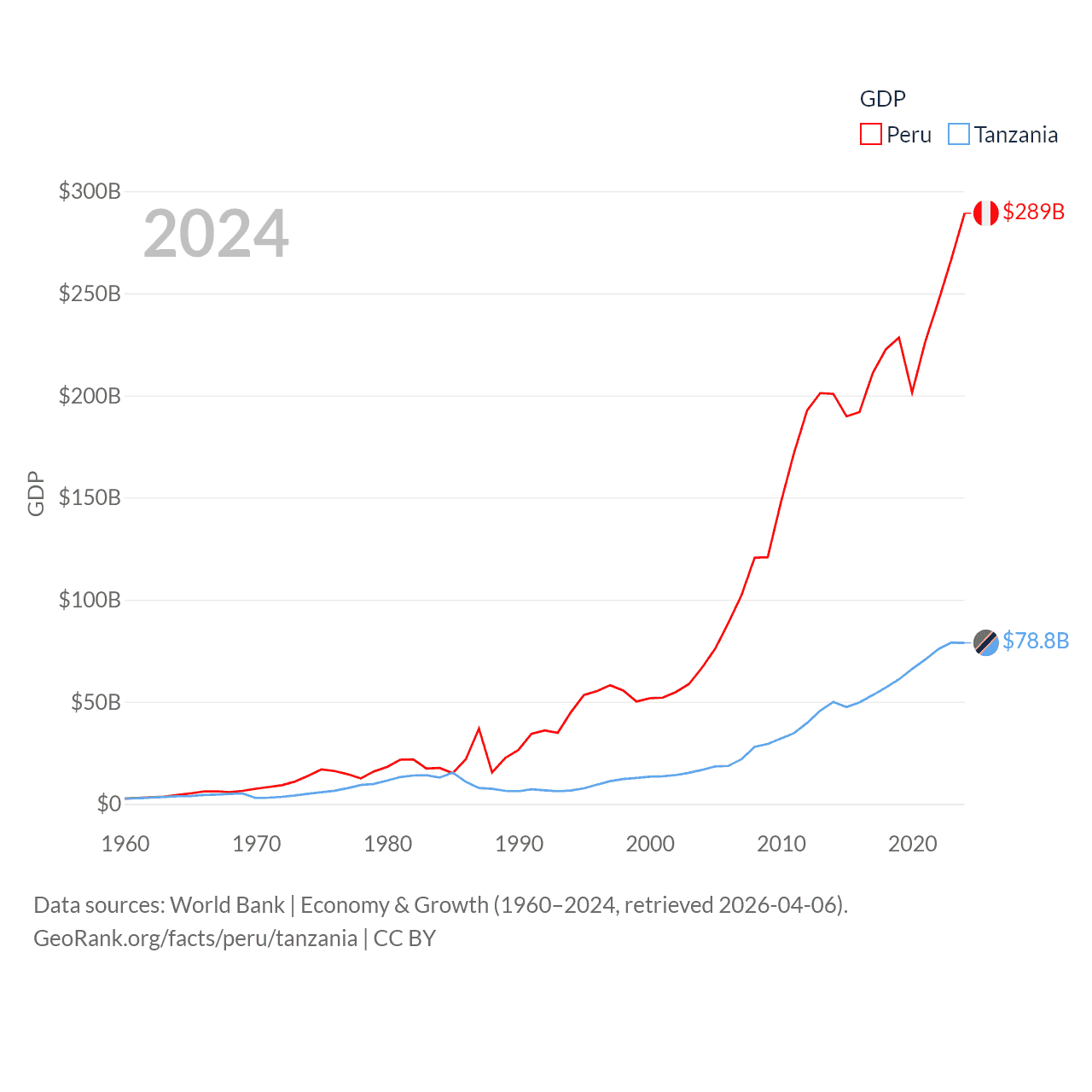 By GDP, Peru ranks 49/197 ($289B) and Tanzania ranks 82/197 ($78.8B). By GDP per capita, Peru ranks 91/197 ($8,452), while Tanzania ranks 170/197 ($1,150).