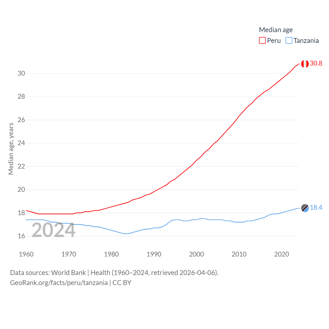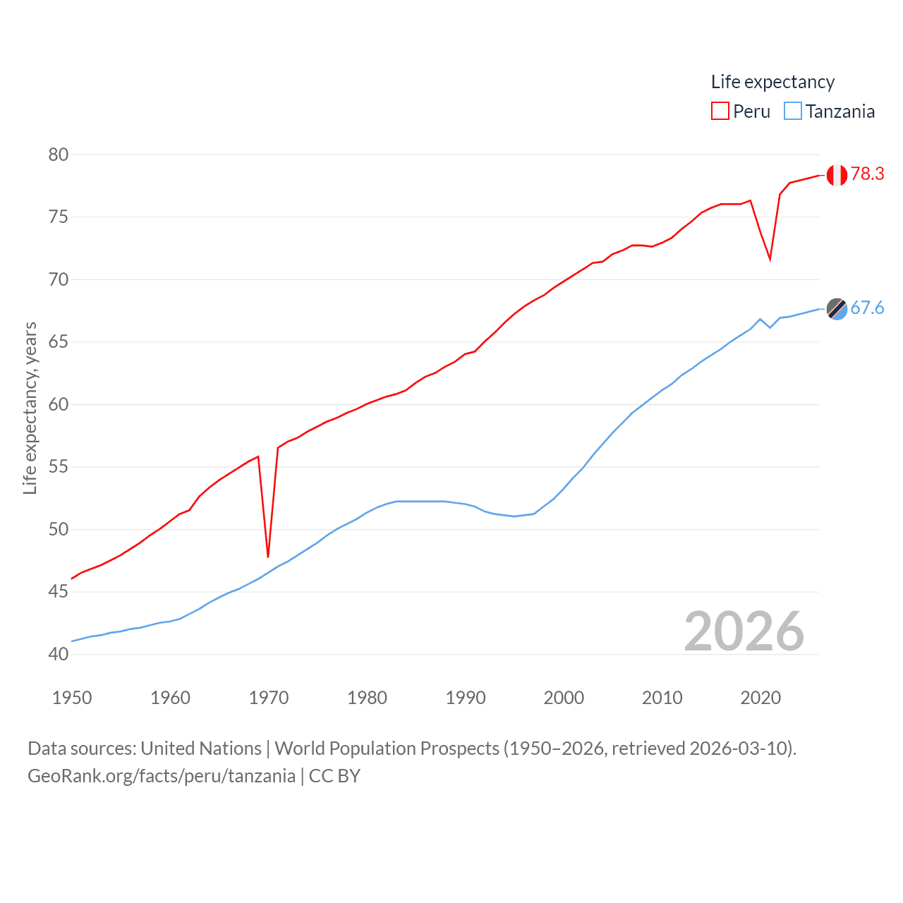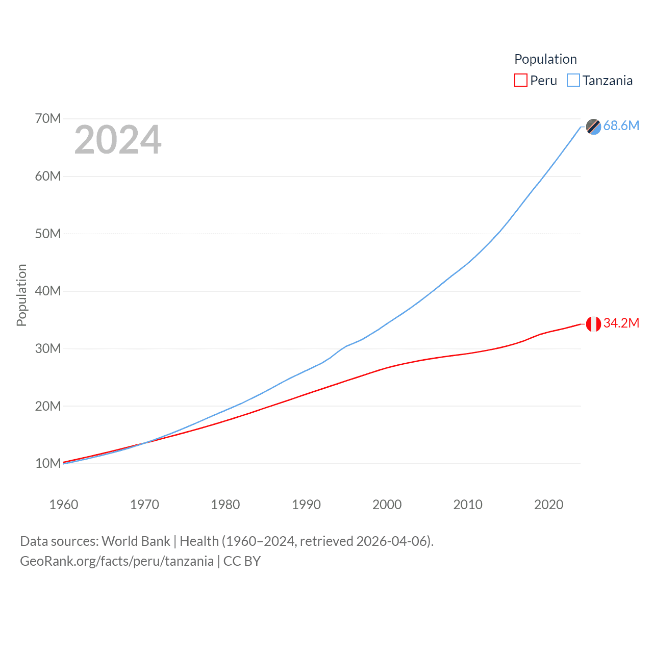 Peru has a population of 34.2M (ranked 48/197), compared with 68.6M in Tanzania (ranked 22/197). Peru's land area is 494,211 sq mi versus 342,009 sq mi for Tanzania (ranked 19th vs. 31st).