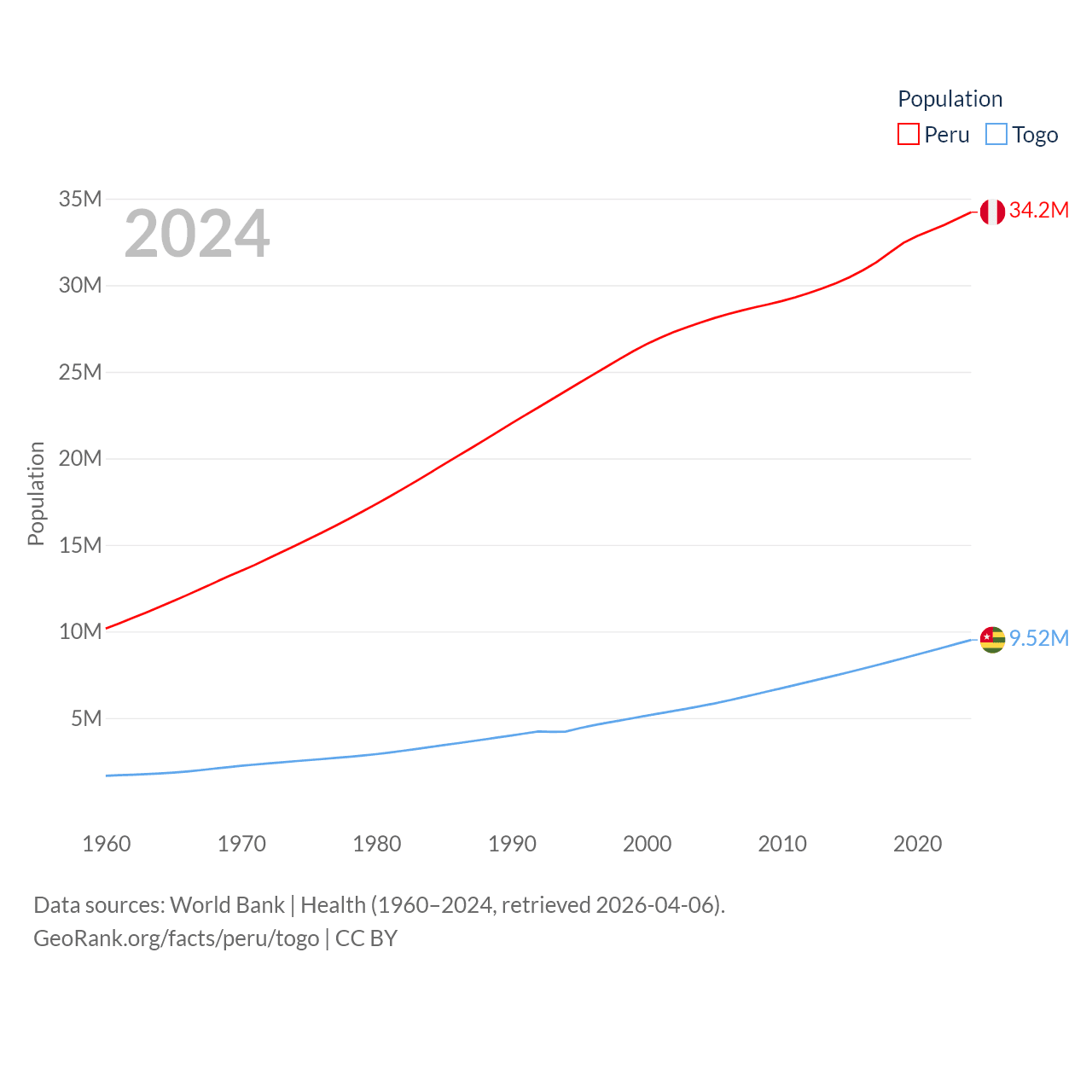 Peru has a population of 34.2M (ranked 48/197), compared with 9.52M in Togo (ranked 98/197). Peru's land area is 494,211 sq mi versus 21,000 sq mi for Togo (ranked 19th vs. 124th).