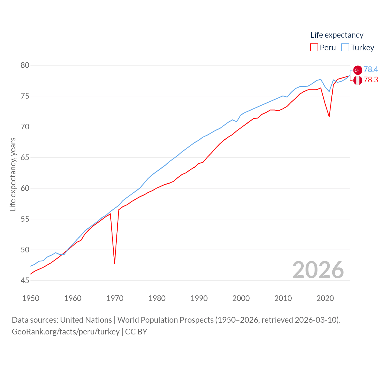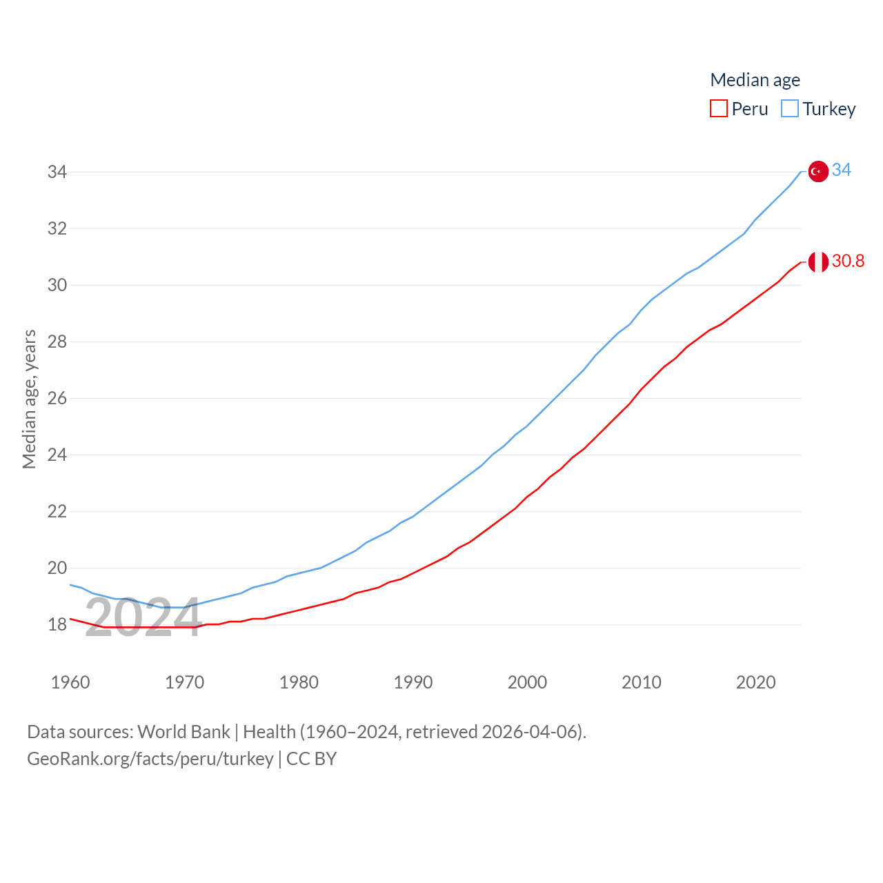 Peru has a population of 34.2M (ranked 48/197), compared with 85.5M in Turkey (ranked 18/197). Peru's land area is 494,211 sq mi versus 297,156 sq mi for Turkey (ranked 19th vs. 36th).